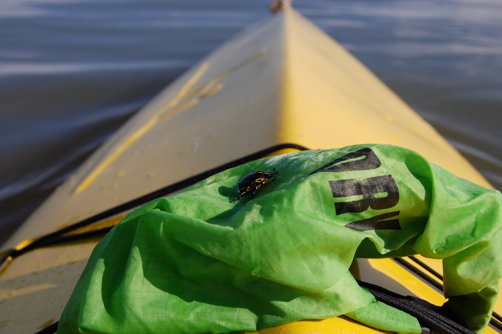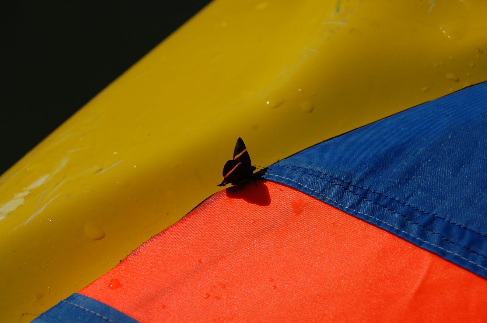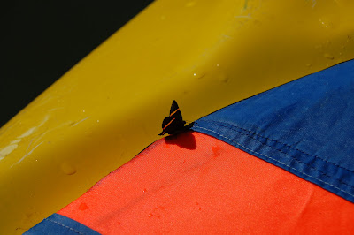 Assim que voltei a remar, uma borboletinha pegou carona na saia do Quindim, mas voou em seguida.
