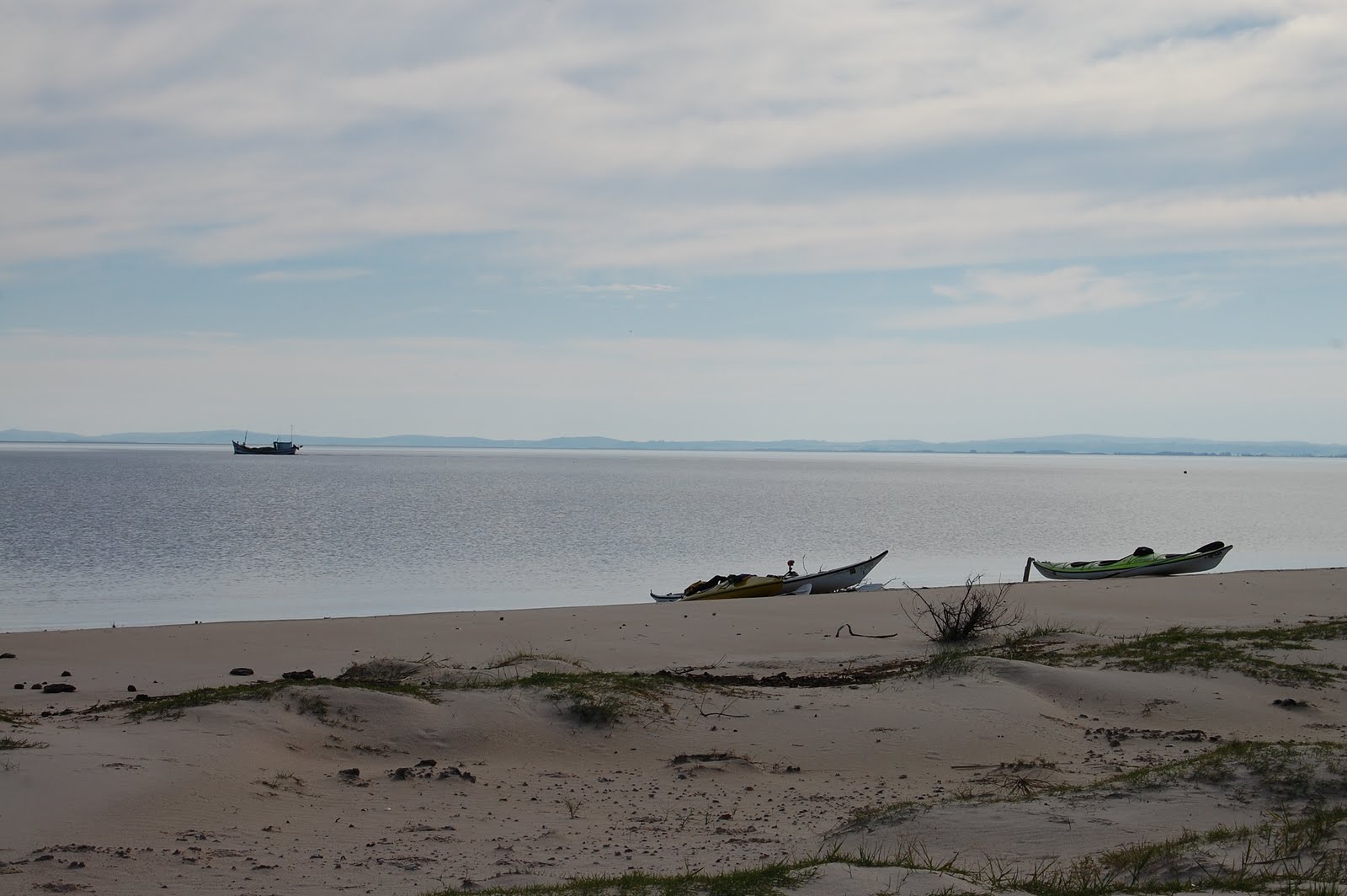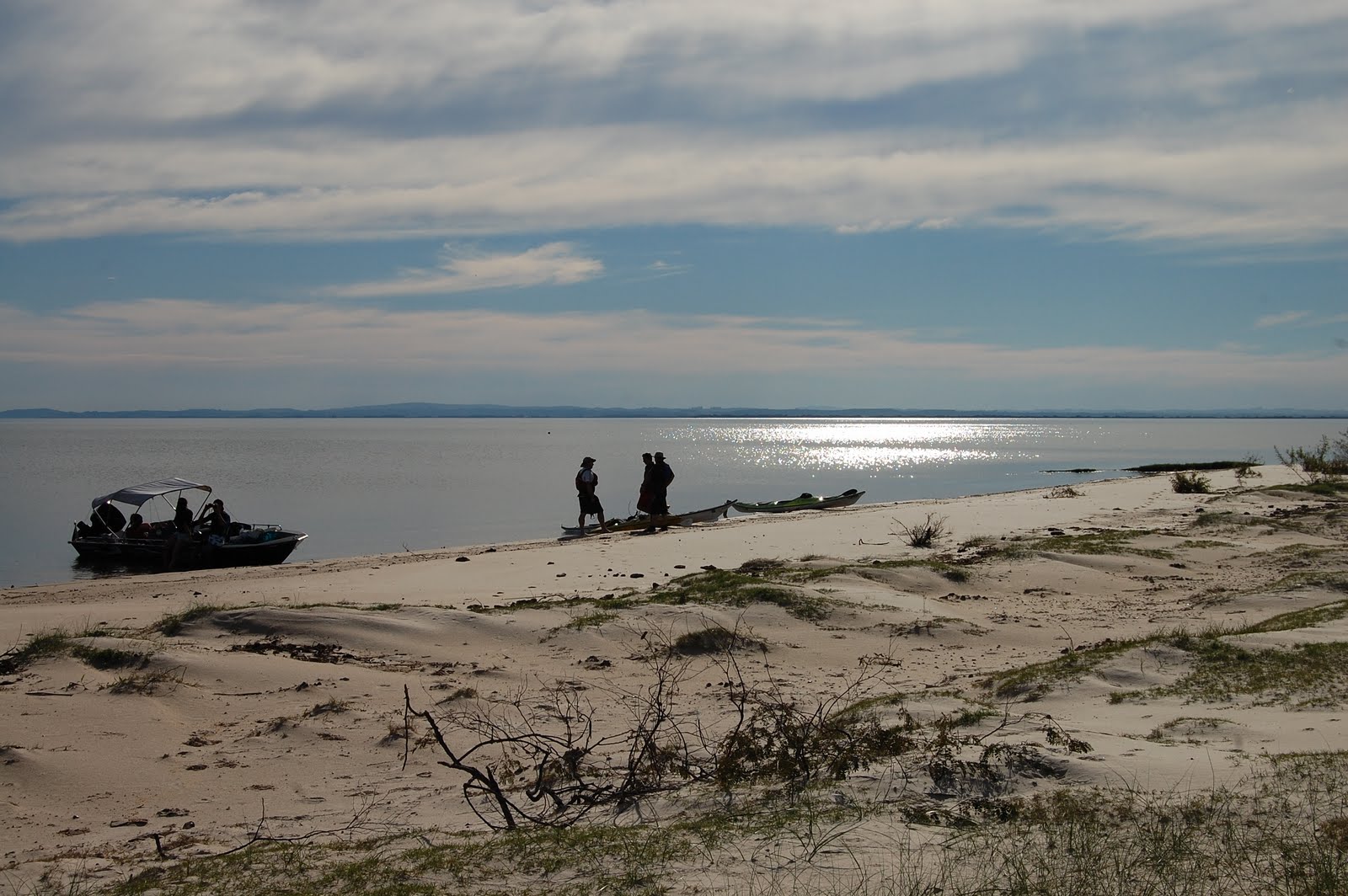 Quase no fim do canal, entrando na Lagos dos Patos, encontramos um pedacinho de terra, bem pequeno onde cabiam exatamente, os três caiaques, e paramos ali mesmo.