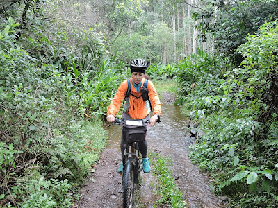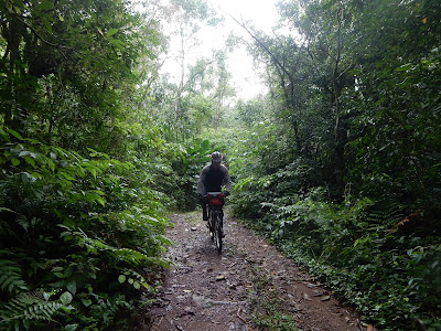 E este, no cantinho da foto, apesar da aparência de abandono, tinha um carro estacionado ao lado. Ali, a estradinha se dividia em duas pequenas trilhas e declarei para o Leonardo que eu não gostaria de seguir adiante por alguns motivos. Primeiro, porque estava chuviscando e o piso muito umedecido e escorregadio. Segundo, porque teria que ir empurrando a bicicleta, pois, ao que tudo indicava, ali começava uma subida ao morro. E terceiro porque a gente escutava muitos cães latindo, e aquele carro ao lado do galpão, colocaram pulgas atrás da minha orelha, me fazendo desconfiar que haviam caçadores na mata e aquele galpão seria o "point" deles. Para evitar stress e quem sabe até, sermos atingidos por uma bala perdida, melhor picar a mula de lá o quanto antes.