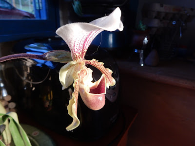 Depois do meu encantamento com esta "orquídea sapatinho", a sogra já me passou mais umas cinco. Perdi o medo! Esta orquídea sapatinho eu deixo na rua, pendurada com vaso e tudo, no galho de uma árvore, mais na sombra do que no sol (bate pouco sol naquele galho).