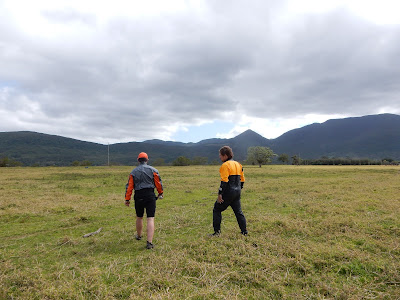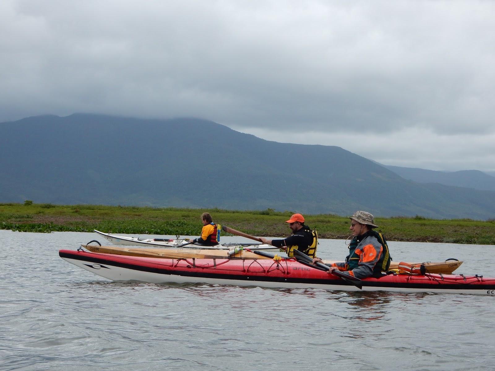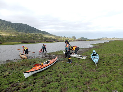 E agora, é só arrastar os caiaques até o braço morto. Kenneth estava remando com o Cupim, caiaque de madeira feito pelo Leonardo, e não quis se arriscar, arrastando o caiaque emprestado, mesmo o Leonardo afirmando que não teria problema pois, o terreno é muito macio, um tapete verde e muito bem aparado pelas simpáticas vaquinhas e terneirinhos que habitam e adubam o local. :)