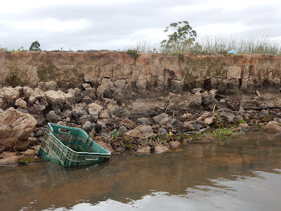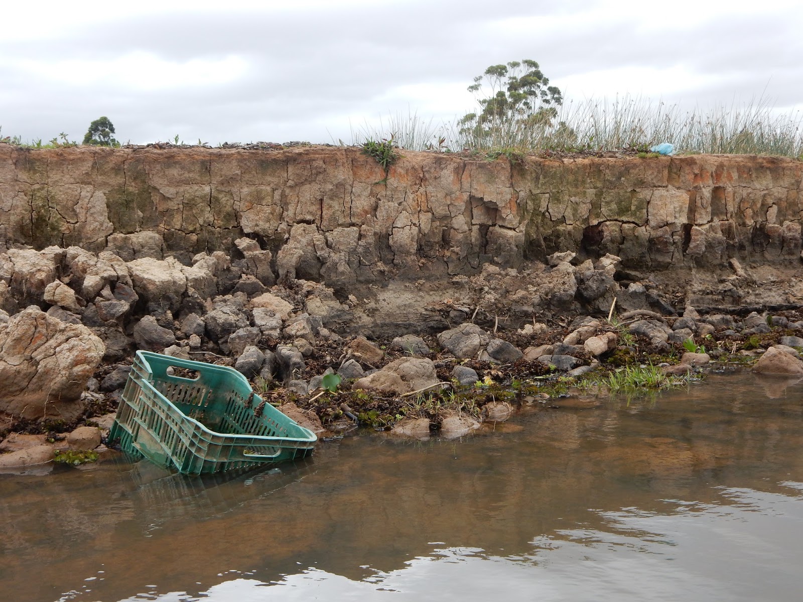 Logo que saímos do braço morto e entramos no rio Maquiné, fiquei impressionada com as margens do rio, sem vegetação e com sinais de erosão. Sem contar as pegadas humanas, deixadas pelos pescadores, caixa e sacos plásticos. Triste realidade!