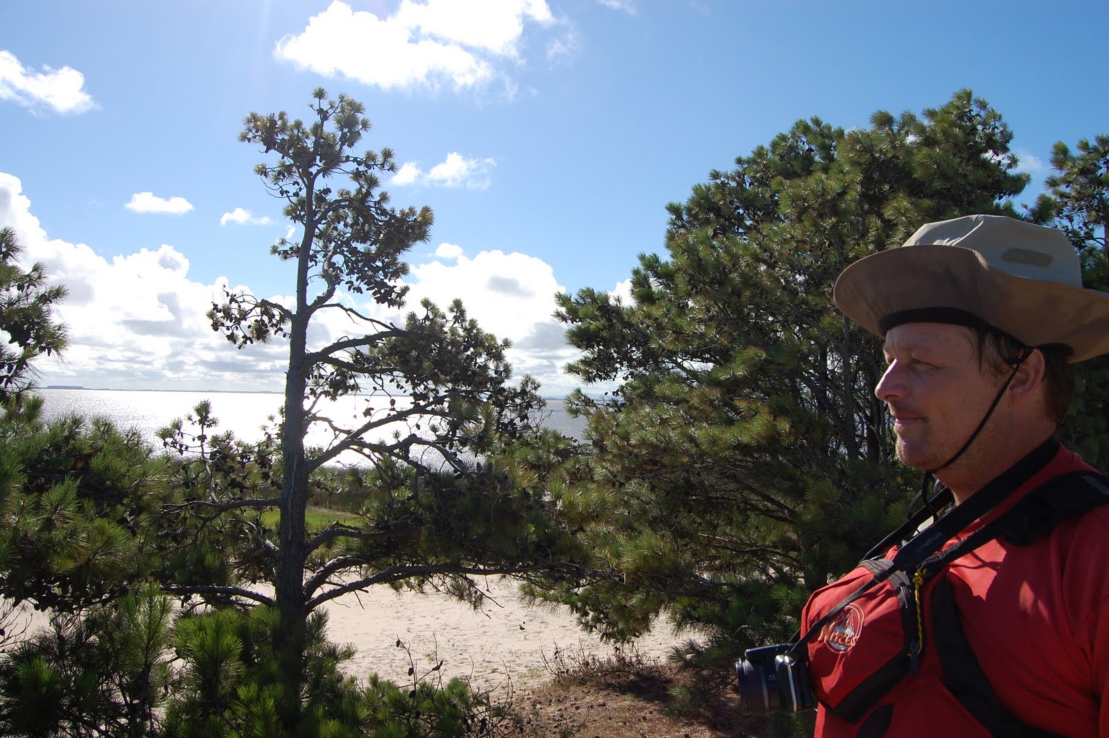 Durante a travessia, Leonardo comentou sobre um pontinho branco que víamos de longe e que ele achou se tratar de uma prainha. Descobrimos que o tal pontinho era uma das embarcações atracadas num tipo de acampamento, um ponto de encontro de pescadores e navegadores. Mais adiante encontramos o nosso acampamento! Leonardo entrou no meio dos juncos para conferir o local, pois ali acabava a plantação de pinus e depois o Pontal se transformaria numa extensa faixa de areia. Desci também e me surpreendi com o que vi: do alto de um cômoro de areia podemos avistar os dois lados da Lagoa dos Patos, pois ali é a parte mais estreita do Pontal. E o mais impressionante é a diferença das águas, de um lado, o lado que viemos, águas calmas, quase sem vento e do outro lado, a mesma lagoa dos Patos parecia um mar aberto com muitas ondas e um vento de arrepiar até o último fio de cabelo!