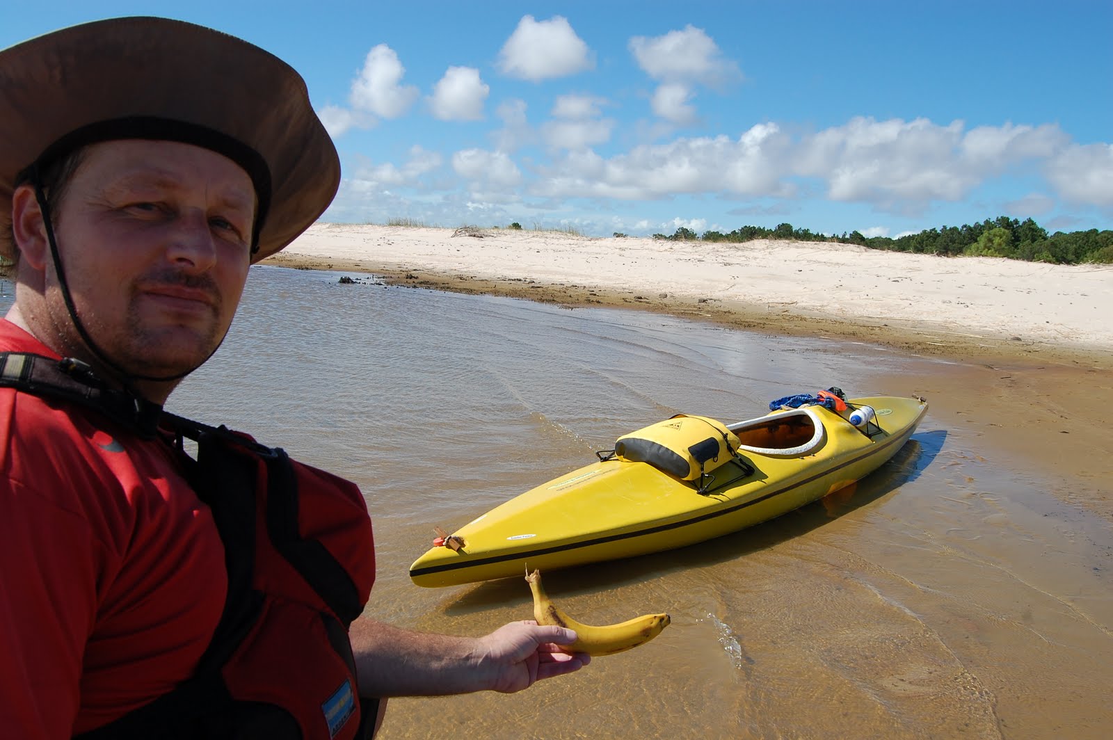 Chegando no outro lado desembarcamos dos caiaques numa bela prainha de areias brancas. A decepção ficou por conta da vegetação, o Pontal de Tapes está tomado de pinus, praticamente nada de vegetação nativa! Após um rápido lanche (bananas), caminhamos um pouco pela prainha, fotografamos mais um pouco e seguimos remando pela costa, protegidos do vento e das ondas.