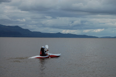 Leonardo entrou com o Pinguim "Tonto" e eu com o Quindim Precioso. Egon e Beatriz também entraram com seus caiaques e o Walter com o Hobie Cat. Leonardo me convidou para andar no Tonto, primeira vez que andava num barquinho à velas. As condições não estavam favoráveis para velejar e em alguns momentos o Tonto ficou parado na água. Voltamos para a praia, pegamos os caiaques e fomos atrás da Beatriz e do sr. Egon que entraram no arroio Cornélios, mas antes de chegarmos no arroio, eles já vinham voltando.
