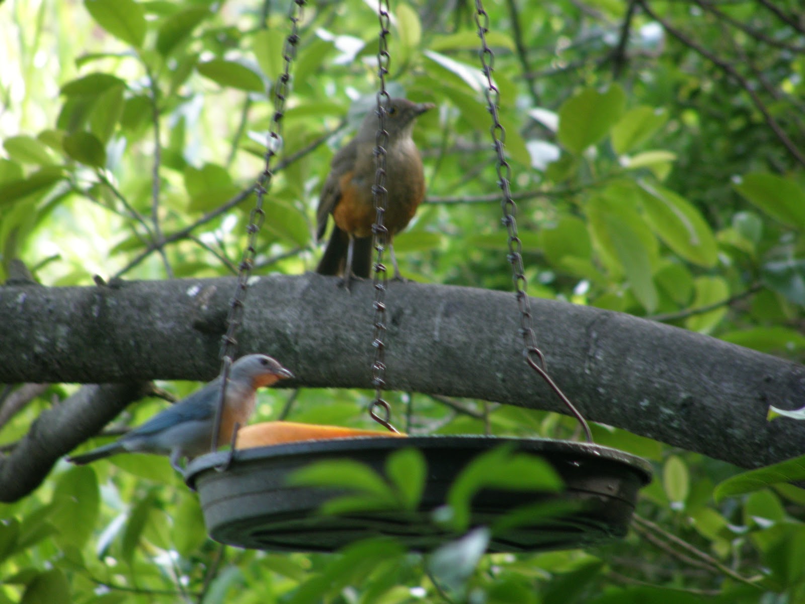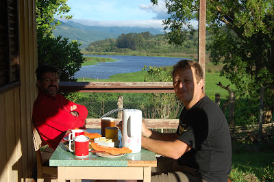 Cadu e Leonardo fazendo a primeira refeição do dia sob a supervisão do Pinheirinho, que fica supervisionando os farelos que caem da mesa.