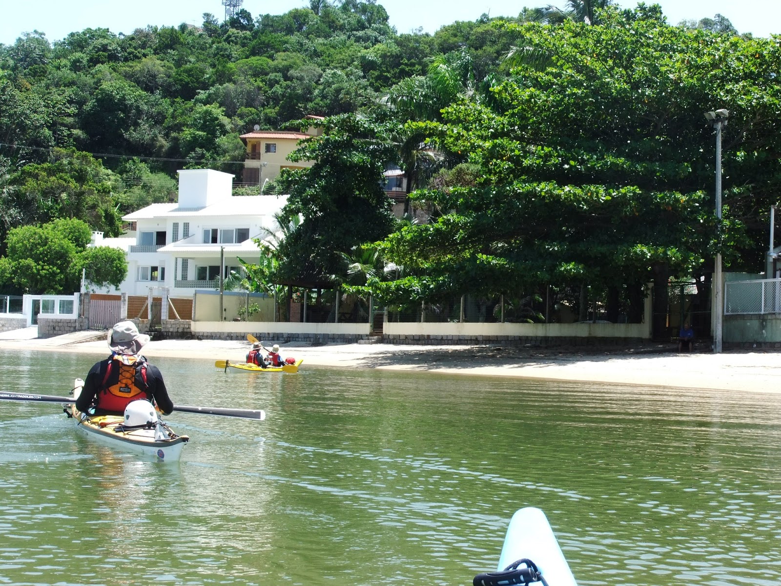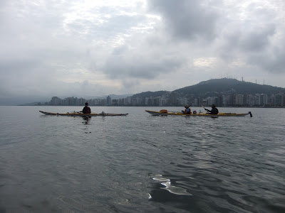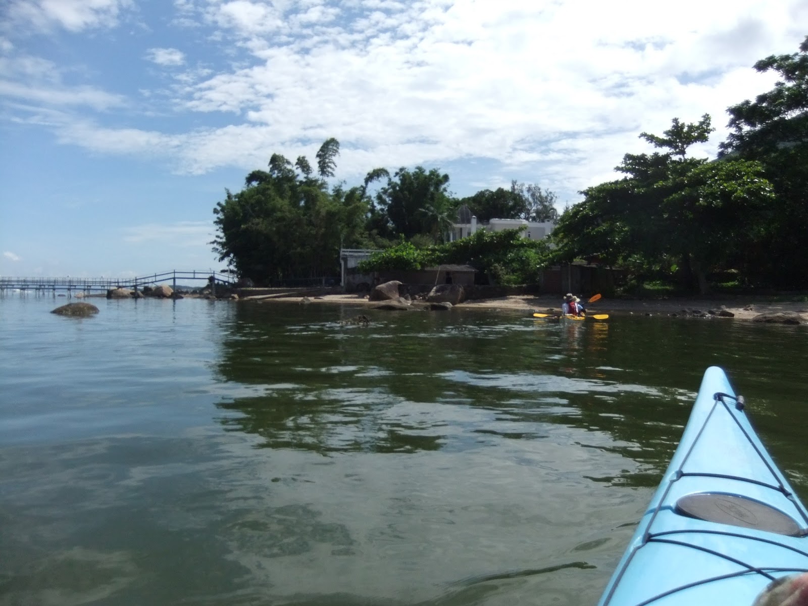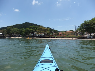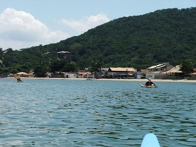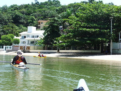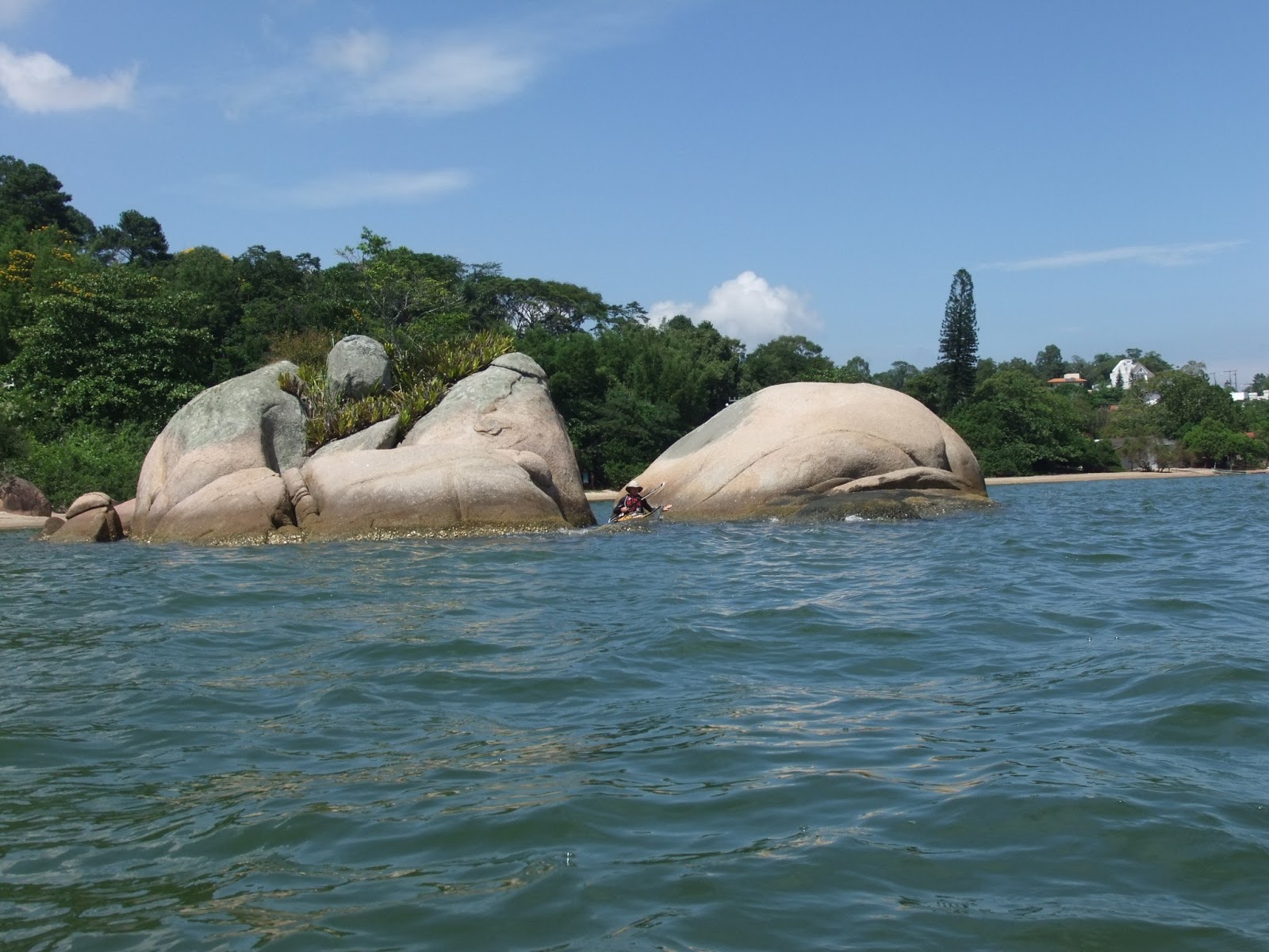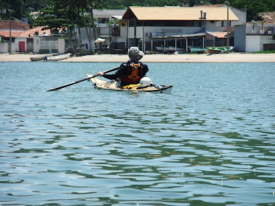 Trieste e Maria Helena saíram na frente. Leonardo me ajudou a entrar no caiaque por causa do mar mexido e das pedras e no que entrei, saí remando, pois não tinha como voltar para ajudá-lo. Depois ele disse que um dos pescadores o ajudou a entrar no caiaque, o que prova que a "coisa" não estava tão tranquila mesmo. Fui remando devagar para não me distanciar muito do Leonardo e de repente, Maria Helena e Trieste, que estavam bem adiantados e já se aproximando da ilha grande, deram meia-volta e vieram na nossa direção.