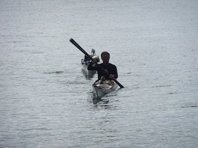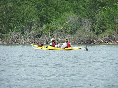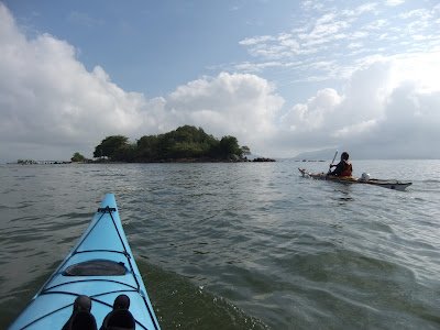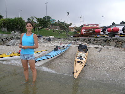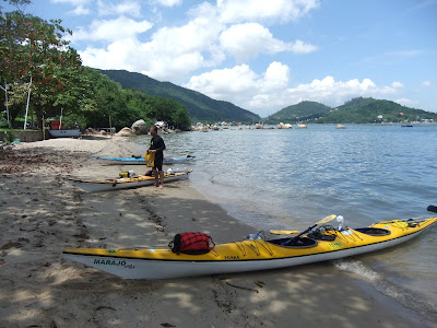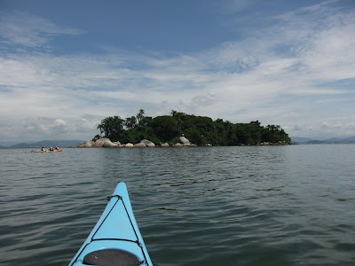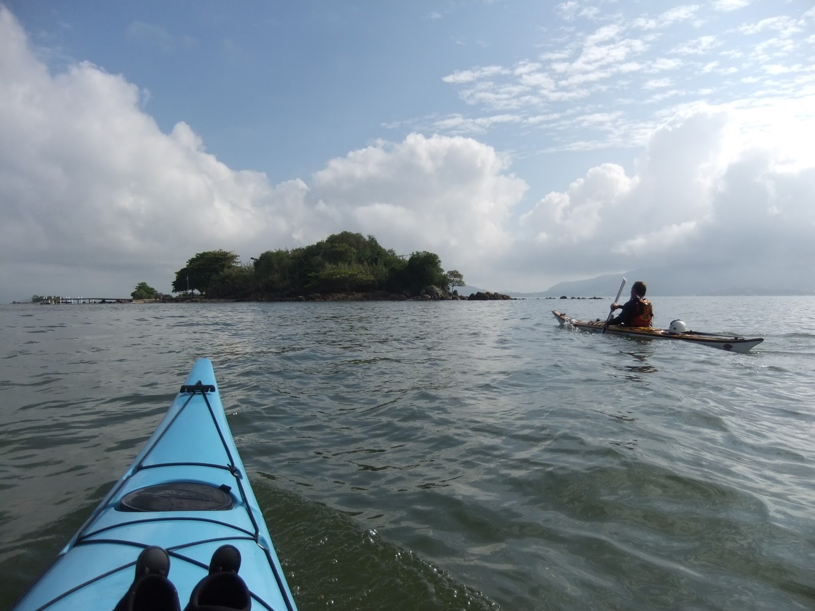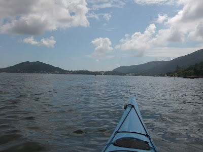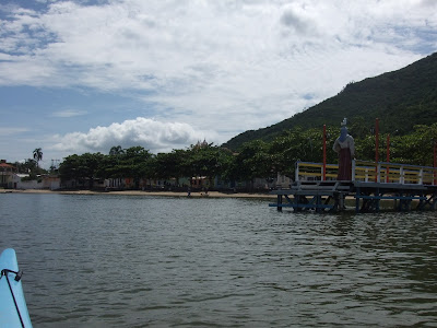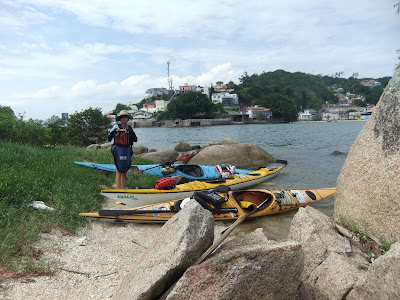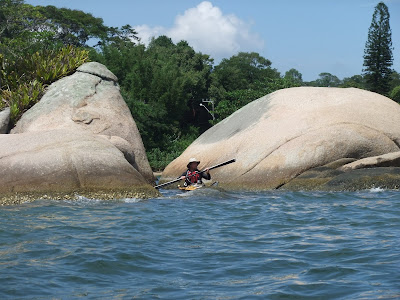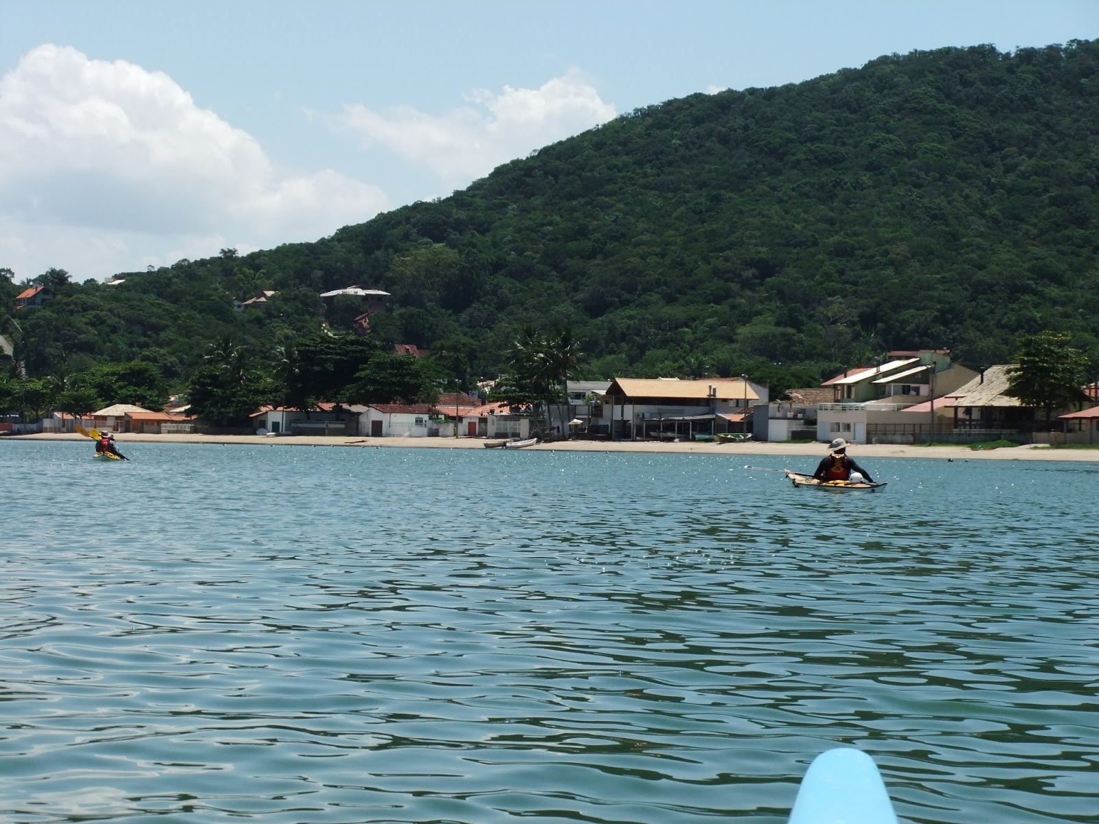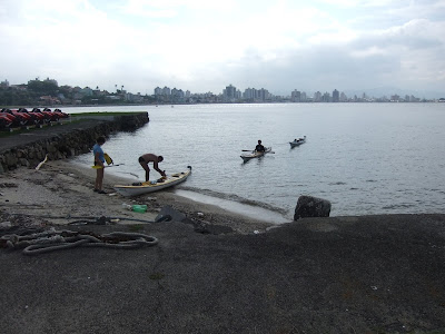 Trieste e Maria Helena saíram na frente. Leonardo me ajudou a entrar no caiaque por causa do mar mexido e das pedras e no que entrei, saí remando, pois não tinha como voltar para ajudá-lo. Depois ele disse que um dos pescadores o ajudou a entrar no caiaque, o que prova que a "coisa" não estava tão tranquila mesmo. Fui remando devagar para não me distanciar muito do Leonardo e de repente, Maria Helena e Trieste, que estavam bem adiantados e já se aproximando da ilha grande, deram meia-volta e vieram na nossa direção.