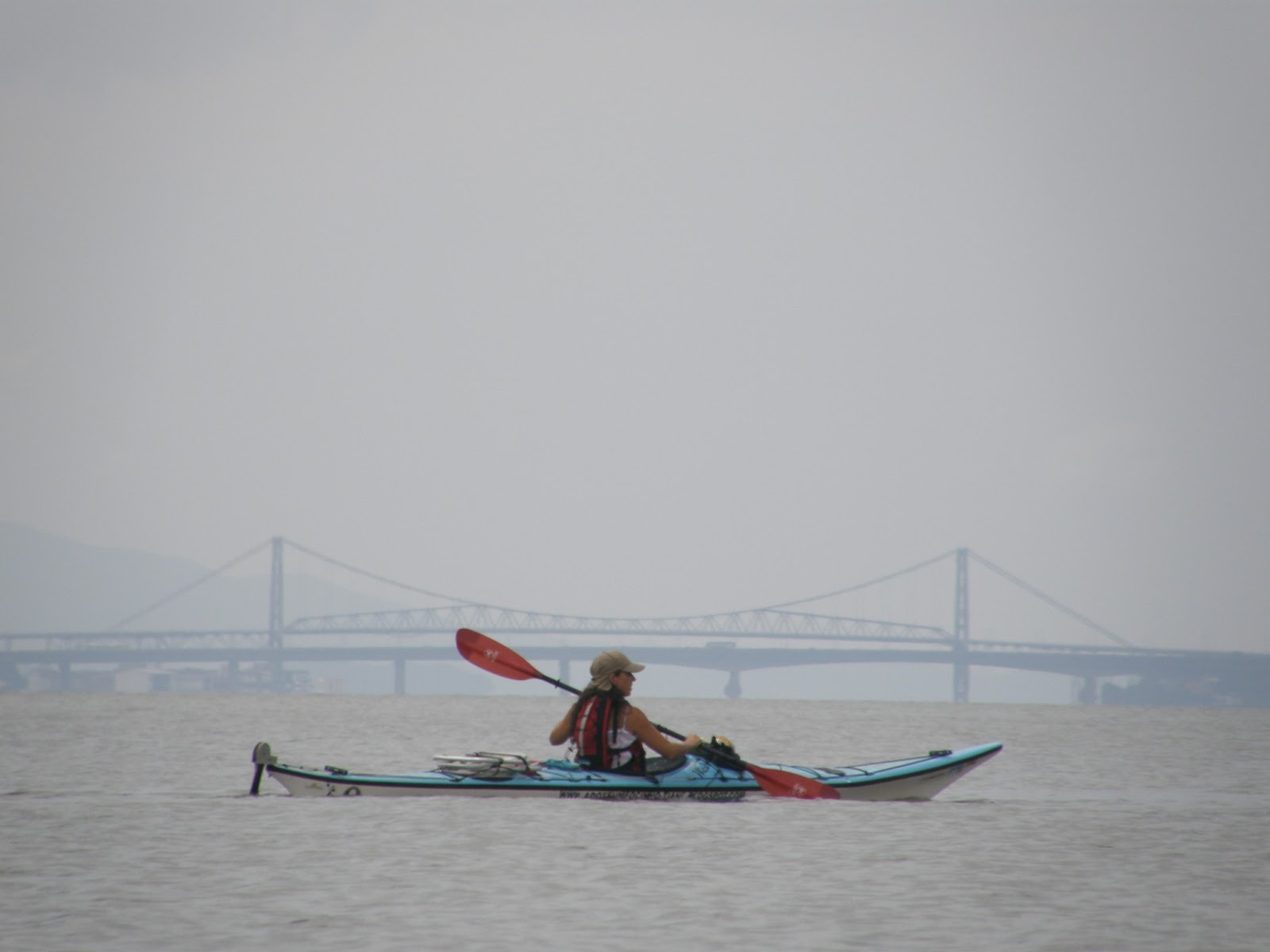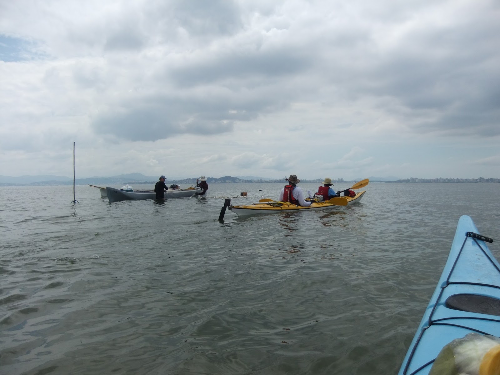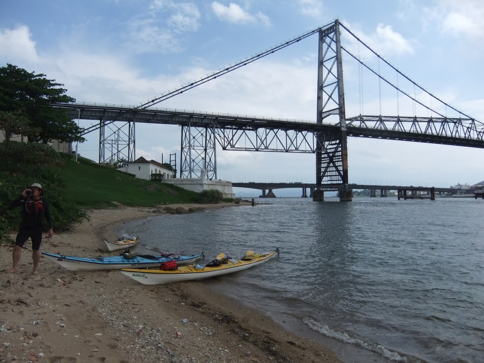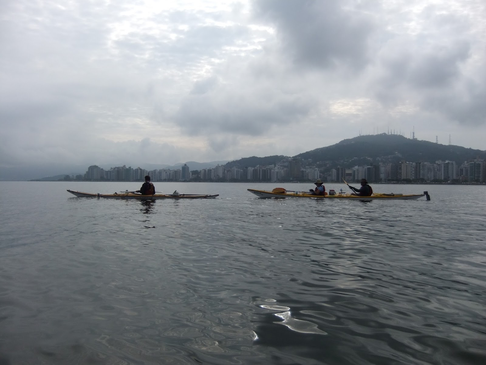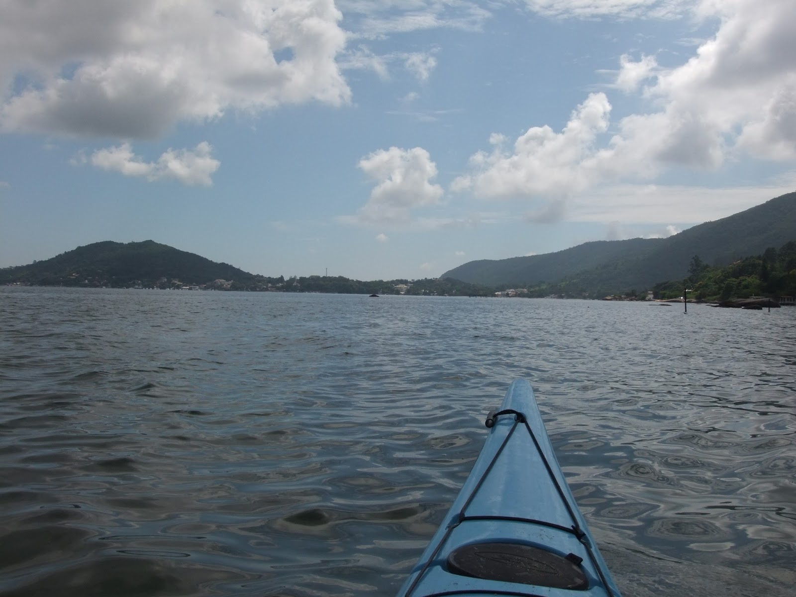 A ideia então, era atravessar de volta para a costa da ilha de Florianópolis, um pouco antes da Ponta da Daniela, onde planejávamos passar a noite. O vento contra judiou de todos e lá pelas tantas, senti que o meu leme não respondia aos comandos. Olhei para trás e vi que ele estava solto, achei que tinha arrebentado o cabo. Me deu um quase desespero, não pelo momento, pois com vento contra não sinto tanta necessidade do leme, mas mais pelo Trieste, que usaria o meu caiaque para completar a volta na ilha, em mar aberto, justamente a parte em que o leme se faz mais necessário.