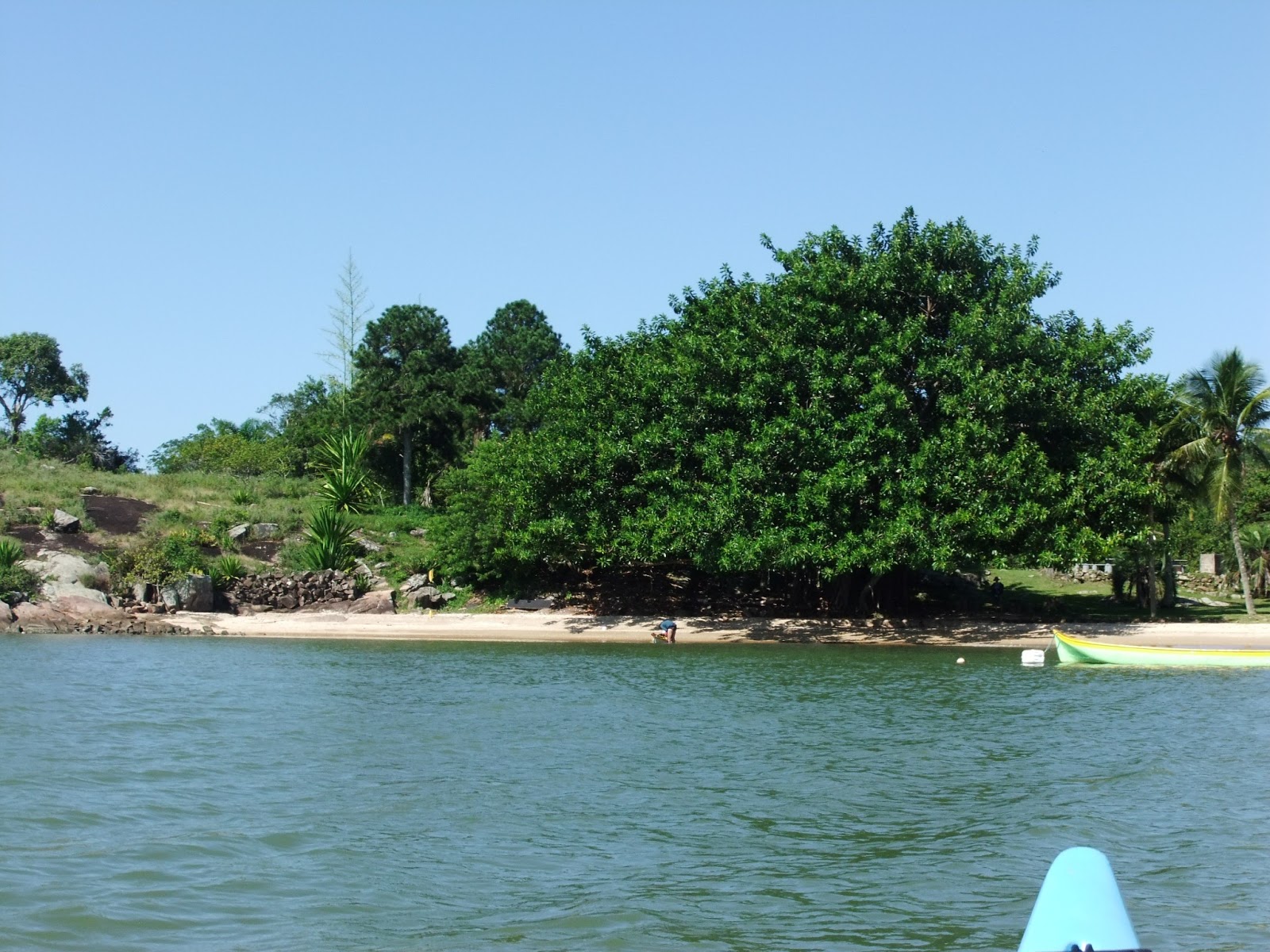 Consegui enxergar o caiaque de Maria Helena e Trieste costeando as pedras em direção à prainha e em seguida, aportando nela. A visão que tinha da prainha ia melhorando a cada remada. Quando vi apenas a areia, já comemorei bastante, mais algumas remadas e dava para perceber uma árvore e esta árvore foi ficando cada vez maior e mais simpática, pois ela estava bem na beira da praia, na areia, e fazia uma sombra espetacular. Achei que se tratava de uma amendoeira, árvore típica da região que tem uma copa maravilhosa, mas para a minha surpresa era uma enorme e respeitável seringueira.