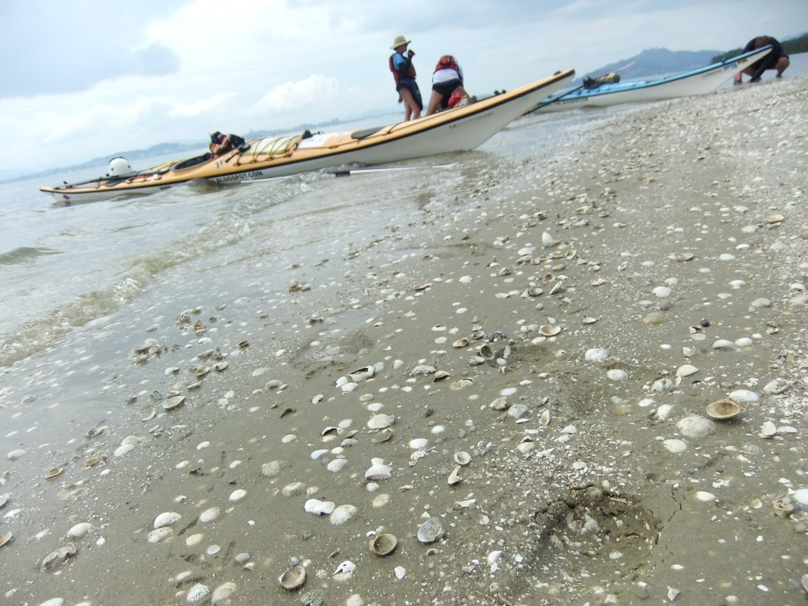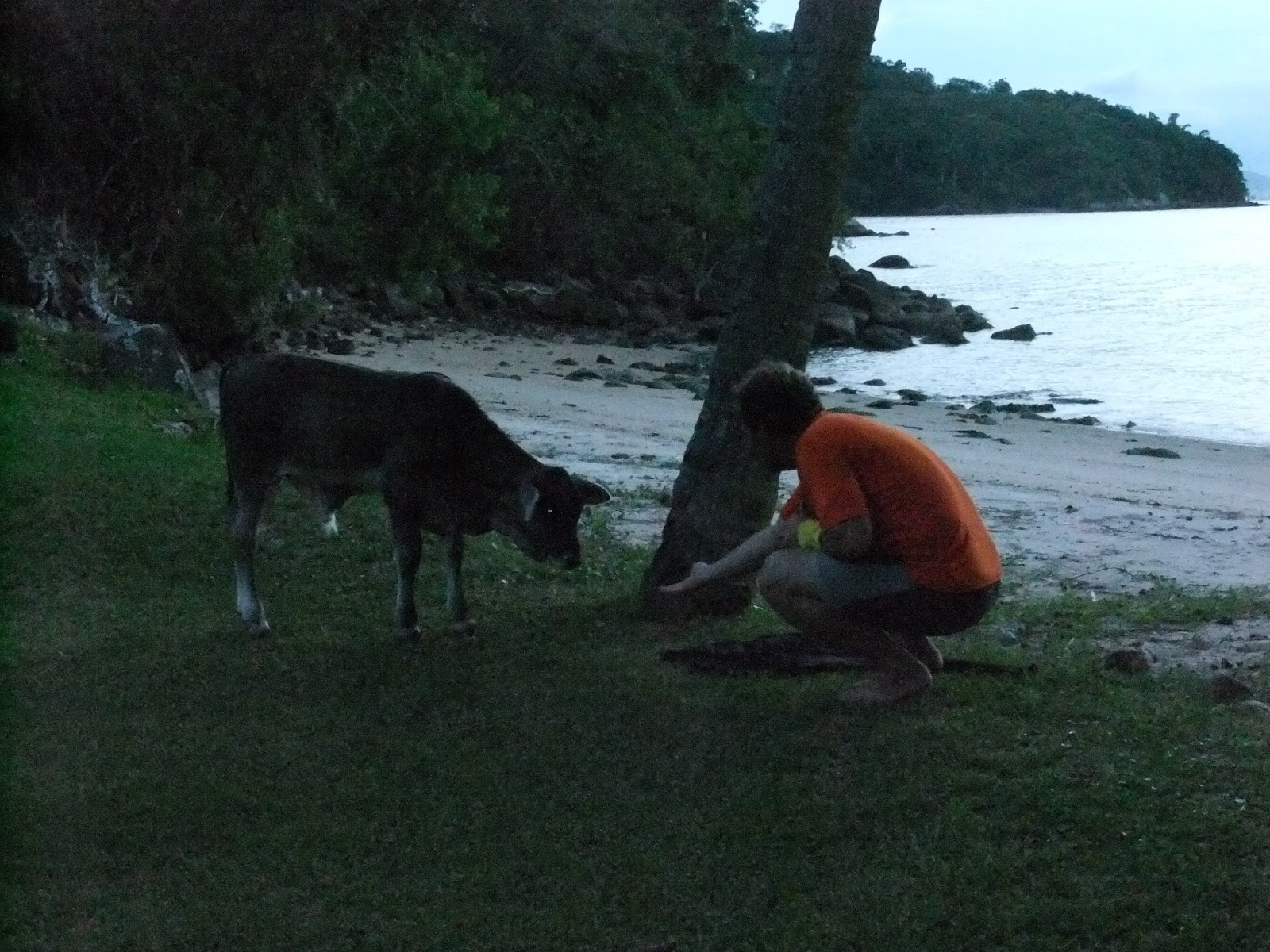 Ah, pois é! Na prosa com o caseiro,ele nos avisou que na propriedade tinha uma vaquinha, mas que não precisávamos nos preocupar que ela era bem mansinha e realmente, ela e o filhote eram bem dóceis, ficaram em volta da gente um bom tempo, tentando comer nossas barracas e tralhas. Quando vi, a vaca pegou, no cockpit do meu caiaque, um saco plástico onde eu havia guardado as conchinhas e os cacos de cerâmicas que eu havia catado até então. Saí correndo atrás da vaca e ficamos num cabo de guerra,onde a corda era o meu saquinho. Finalmente ela largou o saco, todo babado! Éca, que nojo! Ainda bem que não quebrou muitas conchas, mas quebrou as maiores, claro!
