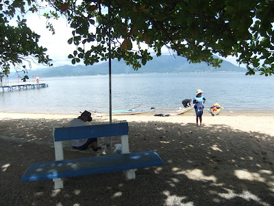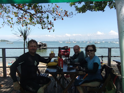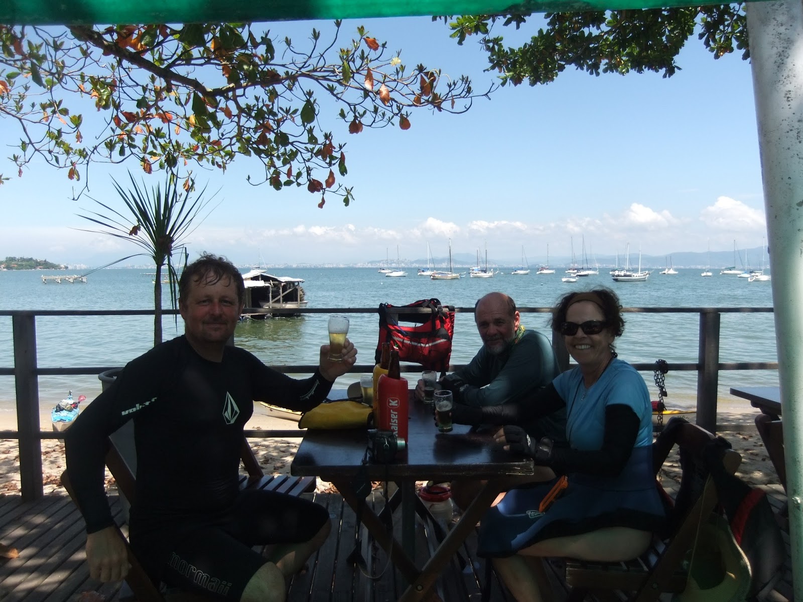 Desde a saída da Ilha do Guará Grande, havíamos combinado de tomar uma cervejinha logo que desse. Para nossa sorte, na beira da praia de Santo Antônio tem mesas de dois estabelecimentos que ficam do outro lado da rua. Se lembro bem, já passava das onze da manhã, mas acho que ainda não eram 11h30 e Leonardo já queria ficar ali para almoçar! Foi vencido pelos votos de Maria Helena e Trieste, que preferiram continuar remando e parar para comer algo na ilha de Ratones, nosso próximo destino. Eu anulei meu voto... o que escolhessem, por mim estava bom.