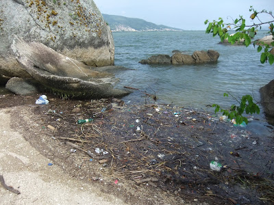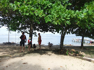 Uma moradora que fazia um vai e volta sem fim, caminhando naquela praia tão...pequena, interrompeu seu exercício para saber o que estávamos fazendo, de onde vínhamos e para onde iríamos. Ficou impressionada e achou muito legal o nosso "projeto" e contou que mora ali, do outro lado da estradinha, numa grande propriedade que é do seu pai há mais de cinquenta anos e uma das únicas "sobreviventes" na região, pois todas as grandes propriedades como essa, haviam sido vendidas e fatiadas, para dar lugar aos famosos condomínios.