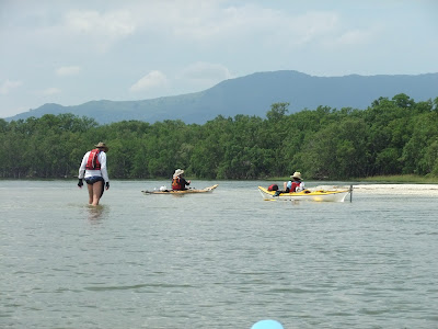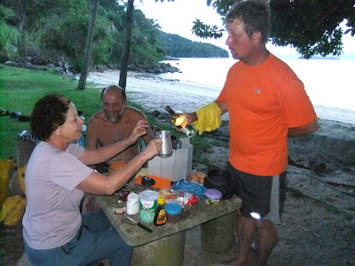 A ideia era acordar cedinho para começar a remar cedo para fugir do solaço e do vento, mas não conseguimos sair tão cedo quanto pretendíamos. Na foto acima, Leonardo, Maria Helena e Trieste tomando café.