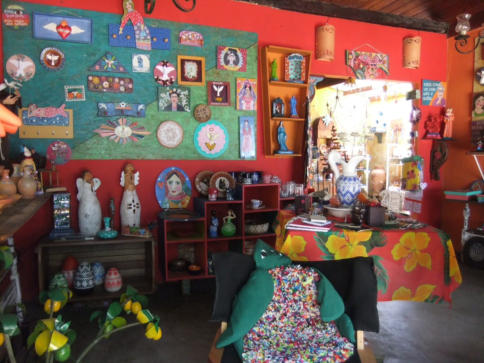 Bisbilhotei pela janela, a atendente até convidou para entrar mas por pura educação, pois eu parecia um ser estranho, molhada, com colete salva-vidas e vestindo a saia do caiaque. Achei melhor não entrar, até para não cair na tentação de gastar, pois o artesanato estava muito lindo.