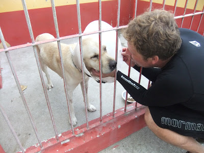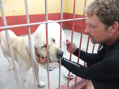Após o café, tratamos de juntar as tralhas e nos despedir dos bombeiros que foram muito gentis e atenciosos conosco. Não podíamos deixar de nos despedir do Faraó, um labrador dos bombeiros, cujo pai fez vários resgates na enchente de 2008, em Santa Catarina. Faraó foi atropelado, por isso está com o colar no pescoço. Leonardo e eu ficamos torcendo para que ele se recupere logo e volte a ativa o quanto antes.