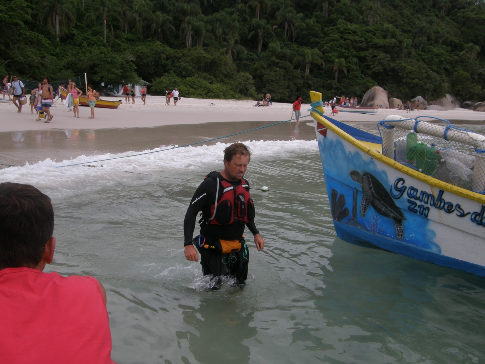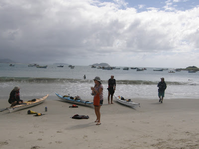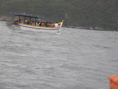 Chegou a hora em que Maria Helena e eu precisávamos voltar. Nos encaminhamos para o nosso barco e os remadores e os sobrinhos de Maria Helena, que moram em Floripa e que chegaram mais tarde que nós, foram até a beira da praia para nos dar tchau.