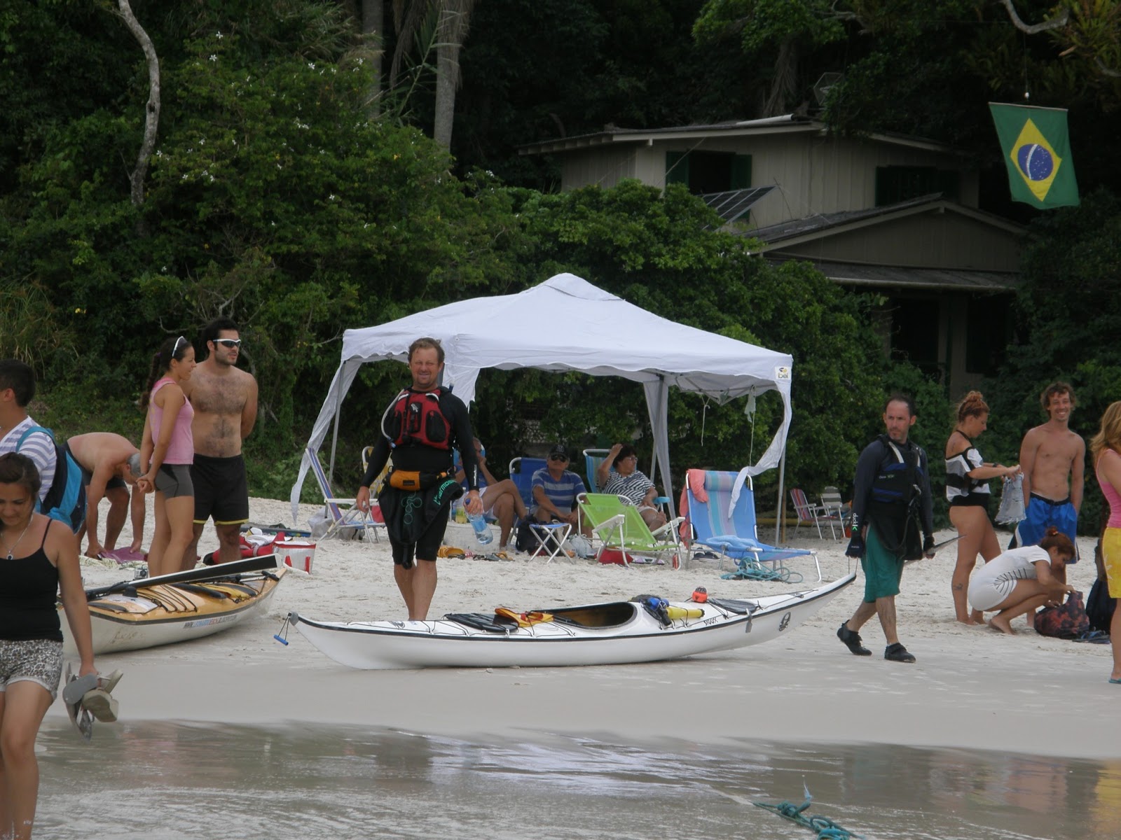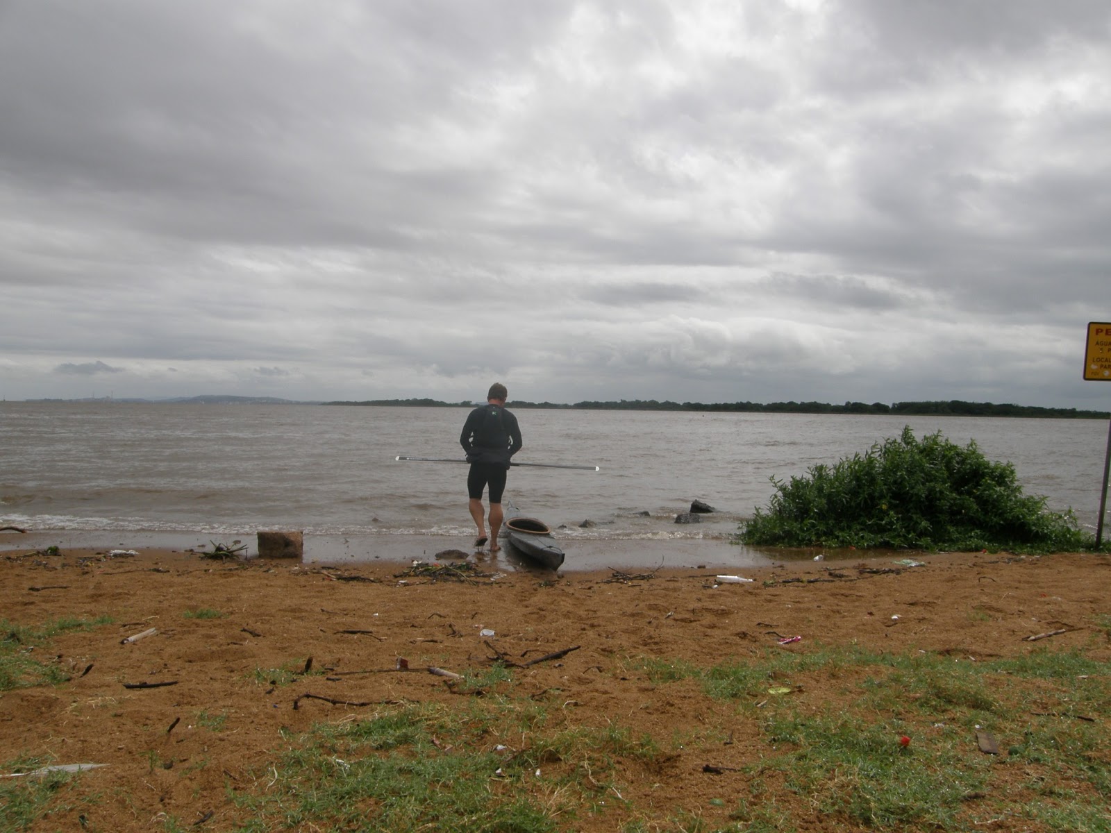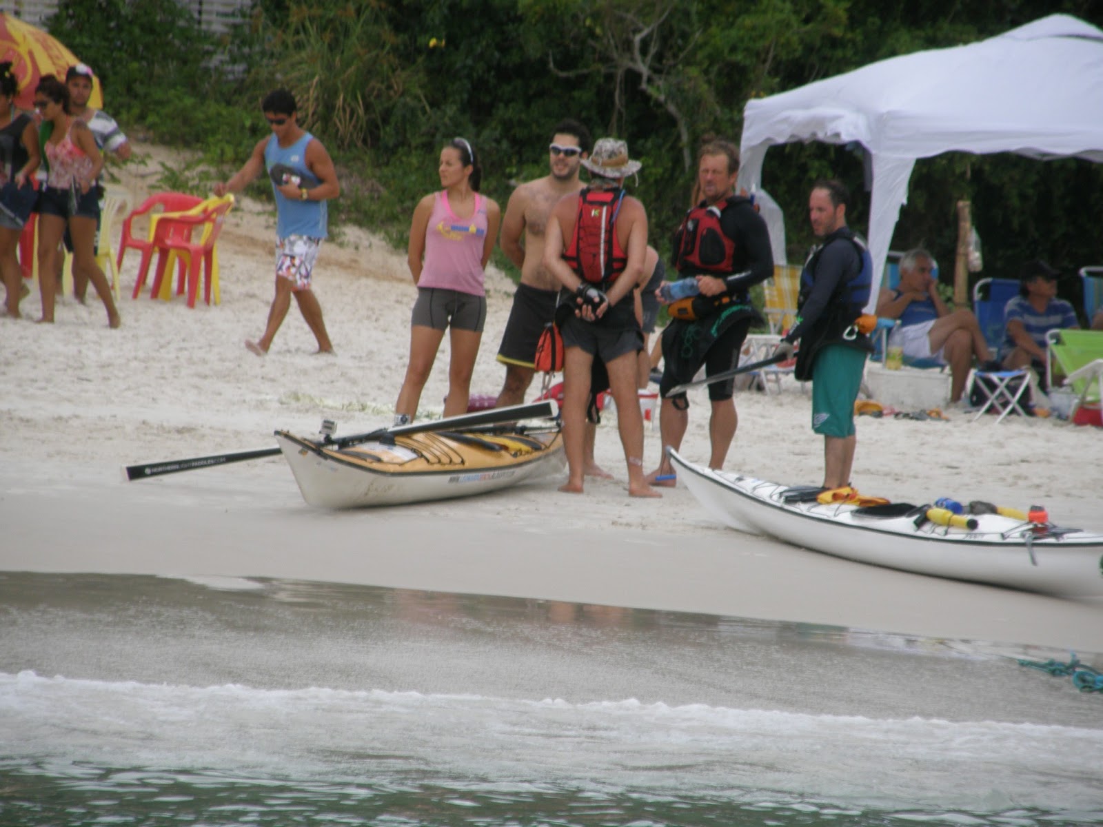 Terminado o blá blá blá, Maria Helena e eu tratamos de pegar uma mesa para a nossa tchurma. Apesar da ausência do sol, me lambuzei com protetor solar e, em seguida chegaram nosso intrépidos remadores!
