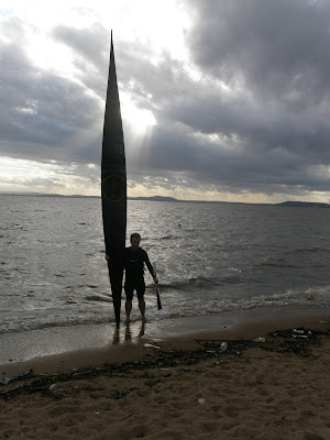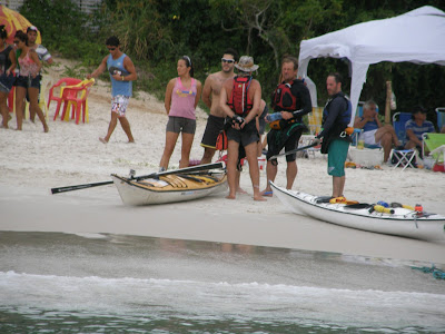 Olhando o mar pela beirinha da praia, não dá para perceber o tamanho do swell que tinha lá dentro! Os remadores entraram no mar antes do nosso barco e, quando alcançamos eles, tentei filmar mas o barco sacudia muito e o swell escondia os caiaques entre uma ondulação e outra. Obviamente, chegamos antes deles mas até que não foi muito antes.