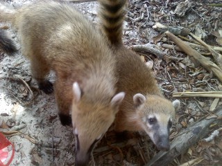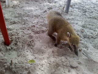 Não passaram cinco minutos e a área do bar onde estávamos foi invadida por um bando de quatis! Eram muitos quatis, acho que uns vinte. Tinha quati grande, pequeno, filhote, fêmeas com as tetinhas caídas, toda uma comunidade. É comum eles andarem pela ilha e chegarem nas mesas em busca de comida. Foi a festa dos quatis e dos turistas que sacaram suas máquinas fotográficas e filmadoras para registrar a invasão. Agora sim, consegui fotografar o bichinho! Eles não estão nem aí para nós, a menos que tenhamos uma batata-frita para oferecer, aí eles chegam bem perto e pegam a batata, sobem nas mesas, é uma bagunça!