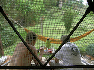 Com a chegada deles, ficamos todos à mesa, bebericando, petiscando e conversando.