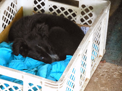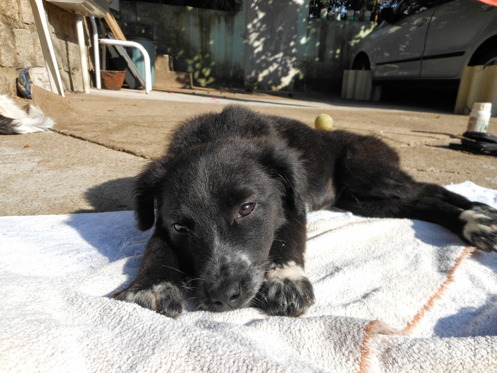 Coloquei-a num canil enquanto dava comida para a bicharada e preparava um banho para ela, que ficou super quietinha na caminha. Depois do banho ficou tomando banho de sol no pátio e se familiarizando com os outros cães.
