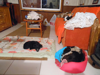 Sissi, no chão, Pinheirinho na caminha e Tombinho no sofá da sala da casinha do Recanto.