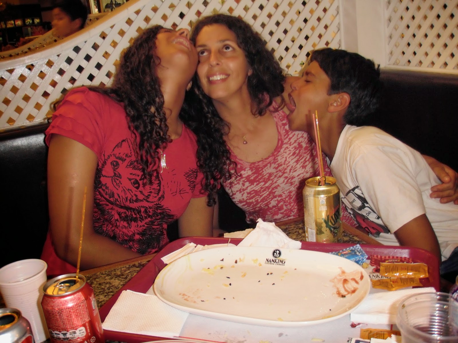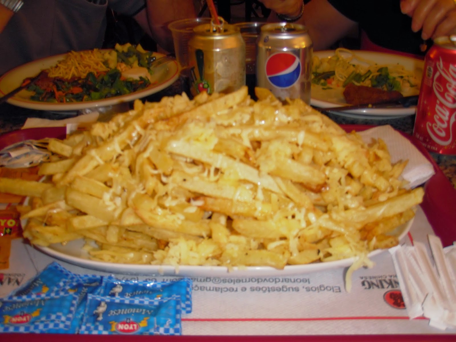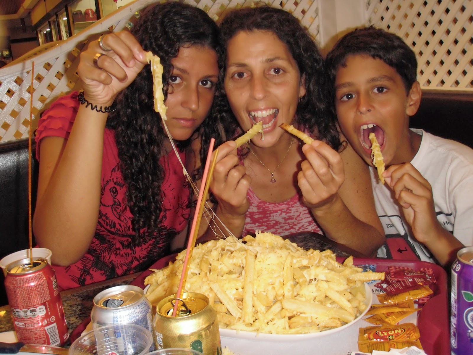 Eu e meus adoráveis pestinhas, meus sobrinhos, numa foto de 2010 detonando uma inocente e gigante porção de batatas-fritas. Coisa bem boa!!!!