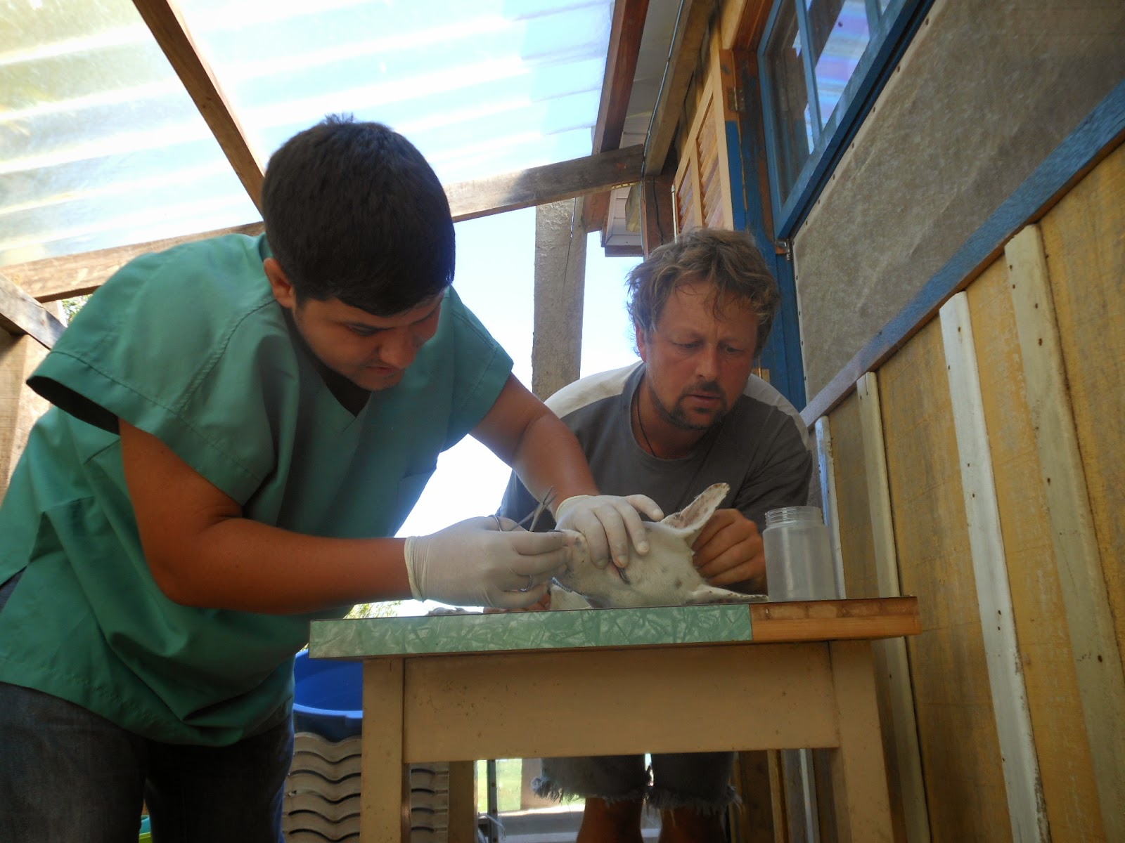 Leonardo com cara de choro e um copo vazio na mão, e meu cunhado Diego.