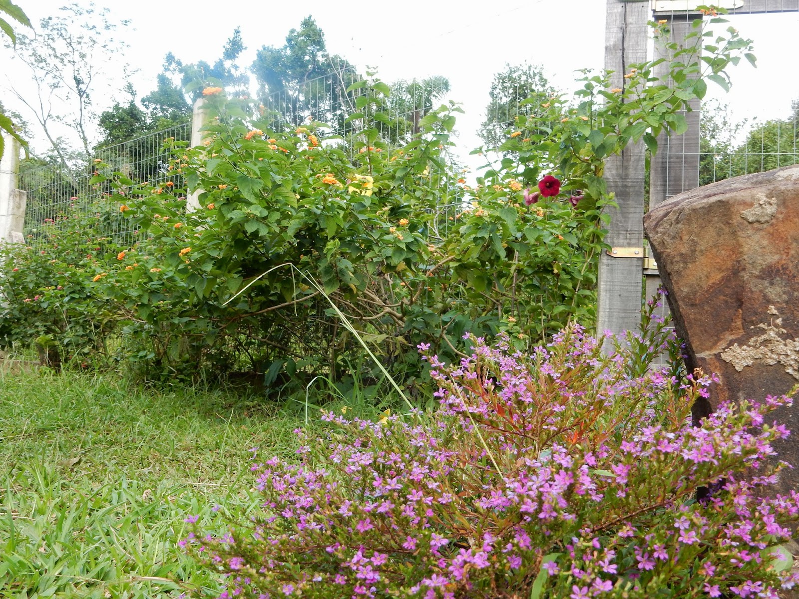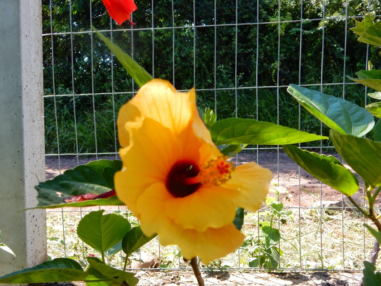 Saindo da parte alta do terreno e descendo para a casa, encontramos este lindo hibisco que não é nosso, está no terreno do vizinho, mas cai todo para o nosso lado, que é mais claro. Que bom!