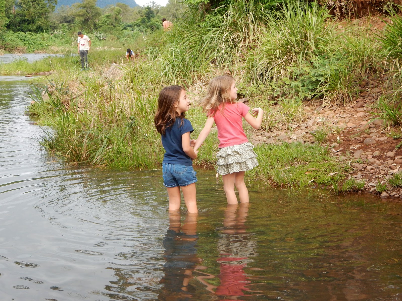Enquanto Leonardo preparava o caiaque, Tombinho ficou olhando o movimento no Balneário. Adorei essas duas guriazinhas caminhando de mãos dadas na beirinha do rio, uma se segurando na outra para não escorregar nas pedras lisas do rio.