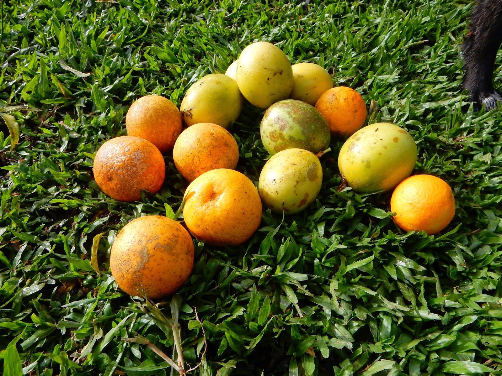 Ontem a mãe fez esta colheita, mas só pegou as frutas que estavam no chão. Tem laranja pra suco, laranja do céu e maracujá.