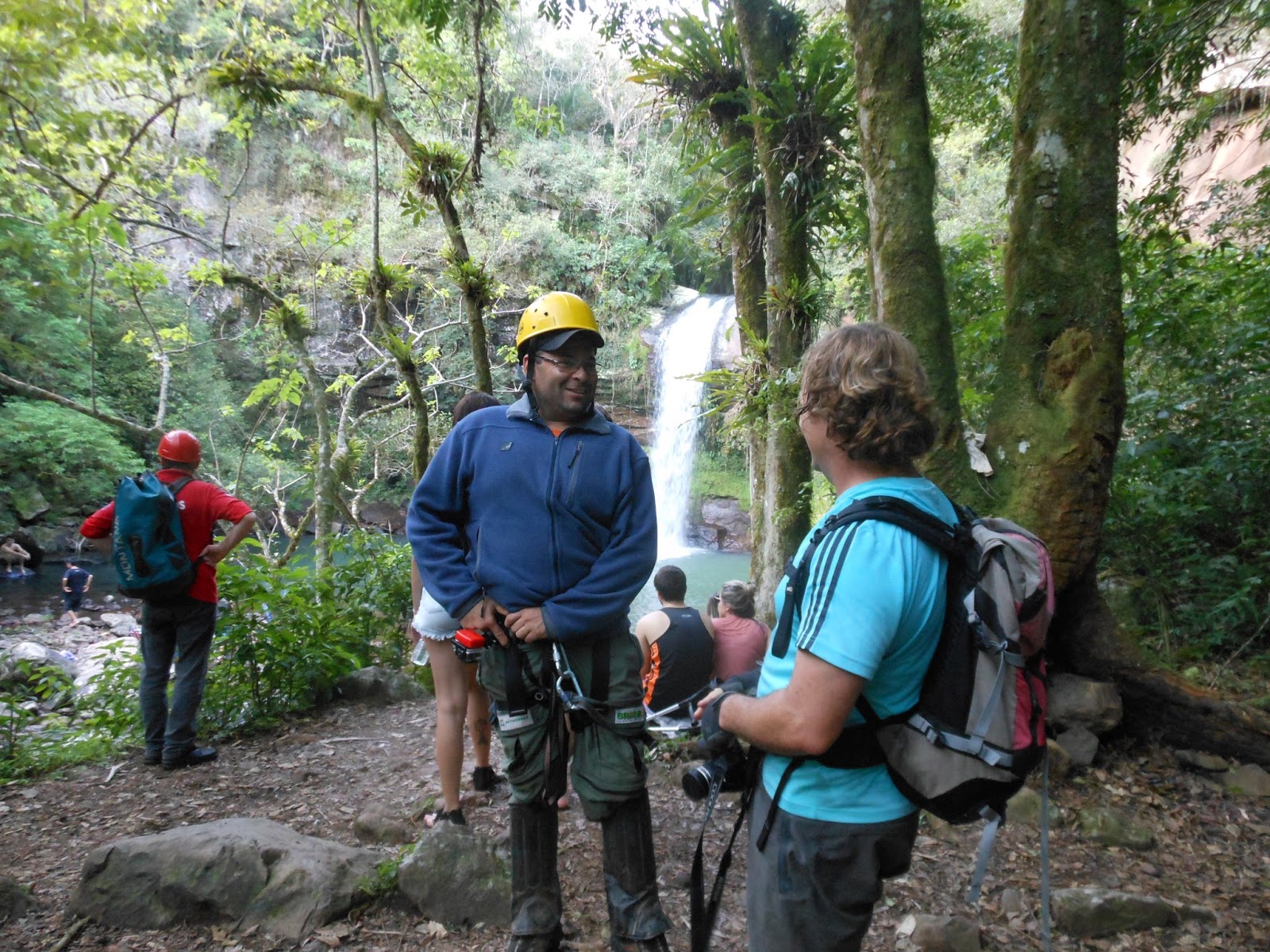 Leonardo encontrou, além do Tiago da ANAMA, que também rema, um outro amigo remador que estava fazendo o curso, e ficaram analisando a cascata para ver se daria para descer de caiaque. Tudo maluco!