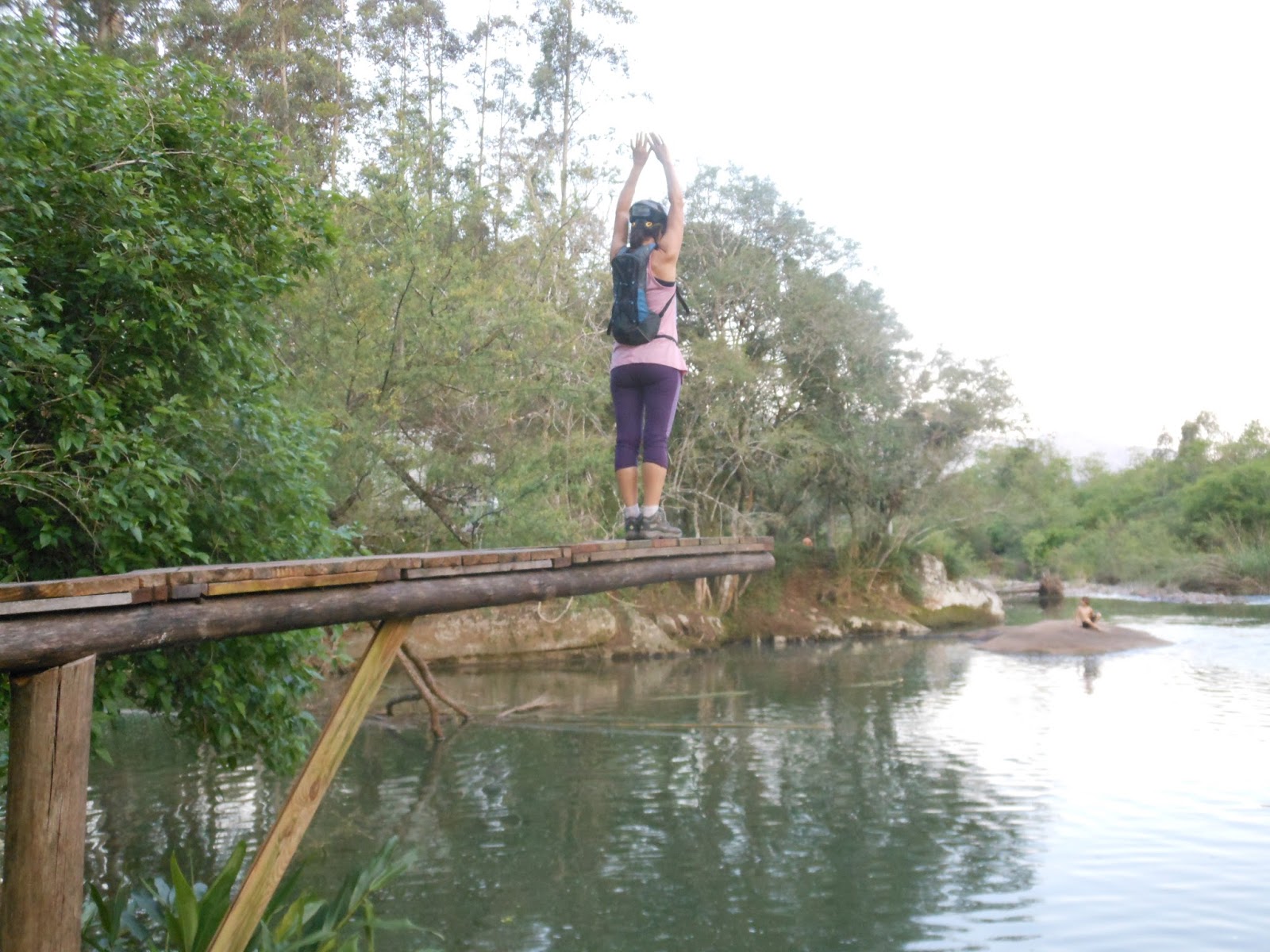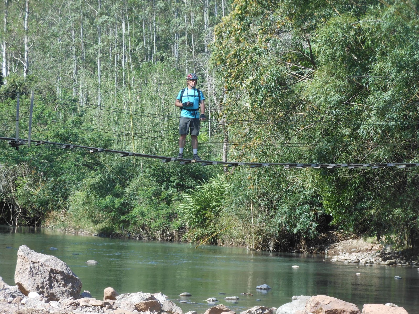 Tiago posando enquanto Leonardo está indo para a ponte pênsil.