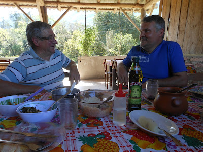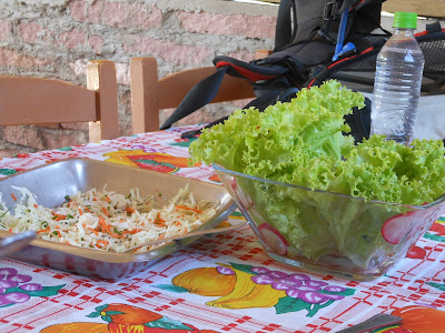 Olha aí, o seu Dilo e o Tiago conversando. O seu Dilo mora num belo pedaço de terra onde planta quase tudo! O almoço é 90% orgânico e tinha couve, moranga, salada de alface, repolho e cenoura, aipim e carnes, que eu não como mas que também eram orgânicos. O que não foi cultivado na casa era o feijão, o rabanete e não lembro sobre o arroz, mas acho que não era cultivado lá. E a coca-cola do Tiago... Tiago não sabe beber água, só coca-cola, acabamos tomando também, mas não temos por hábito tomar refri.
