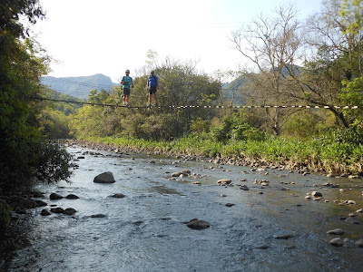Na foto de cima, eu estava na ponte de pedra fotografando o Leonardo na ponte pênsil, e na foto abaixo, o Leonardo, na ponte pênsil, fotografando eu e o Tiago na ponte de pedra.