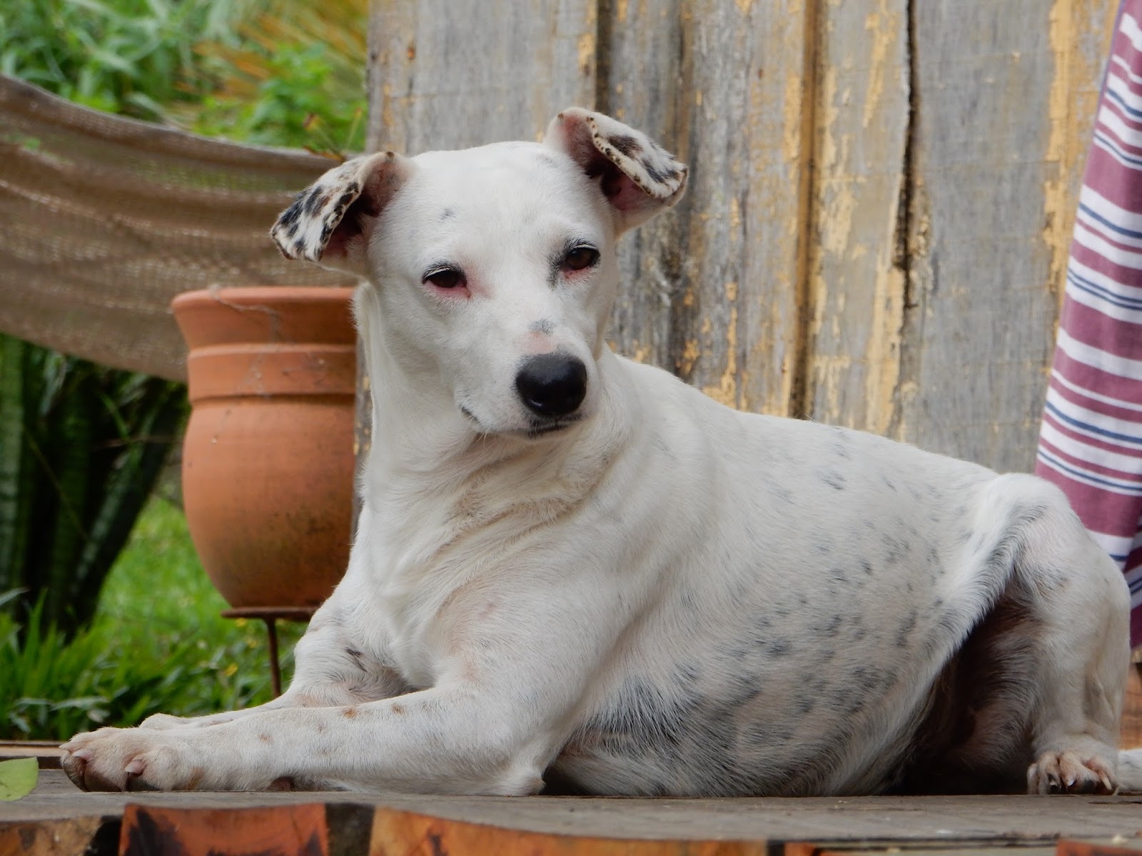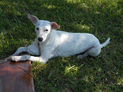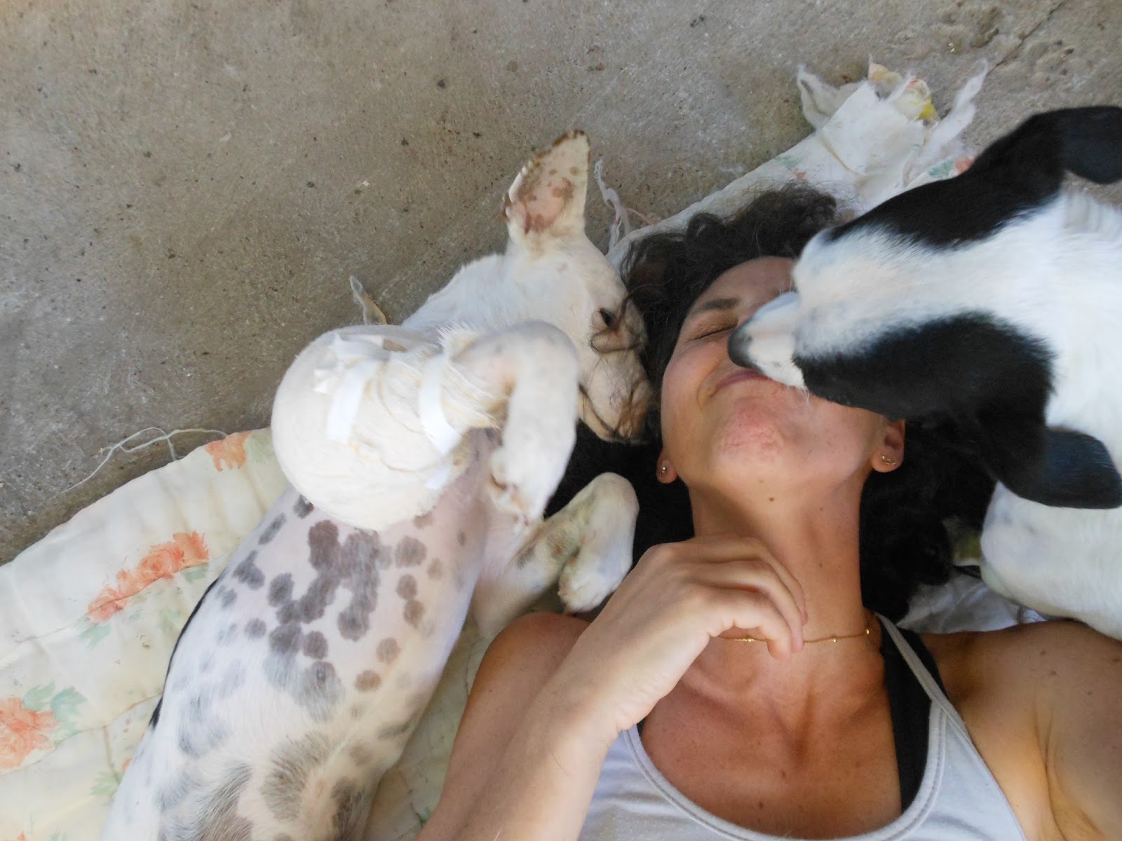 Mesmo com dor, o Costelinha era carinhoso, e o Tombinho, parecia que sabia que eu estava nervosa e foi nos animar. Estava muito calor aquele dia e ficamos um bom tempo deitados no pátio, esperando a dor e calor passarem. Um consolando o outro!
