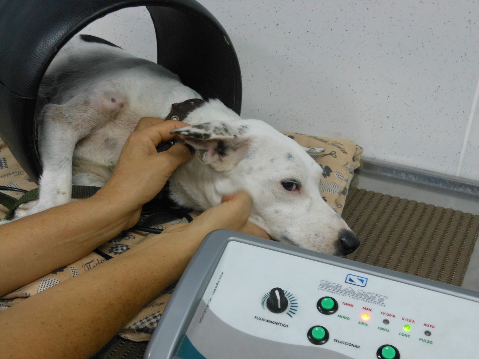 Ele tinha que ficar mais de meia hora dentro deste tubo, recebendo alguma energia. Tinha uma outra onde ele recebia pequenos e imperceptíveis choques. Mas depois de algumas sessões, não vimos nenhum resultado, fizemos novo raio-X e a veterinária falou em amputação da pata. Nunca mais aparecemos lá!