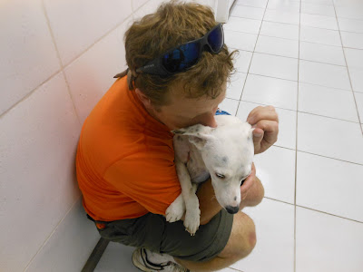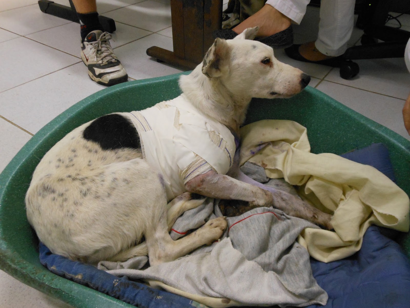 Na foto acima, ele já tinha recebido um primeiro atendimento onde a veterinária disse que, o pior não era o ferimento a bala e as inúmeras larvas que o devoravam vivo, mas sim, a fratura causada pela bala e que deveria ser tratada logo. Estávamos esperando atendimento no Hospital da Universidade Federal do RS. Pela carinha dá pra ver que ele estava com muita dor, mesmo medicado.