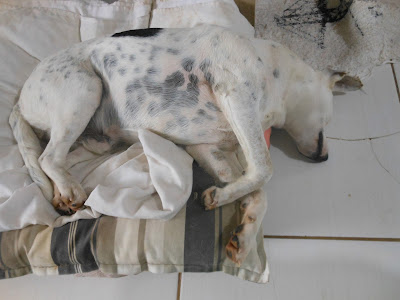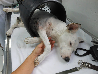 No começo ele sentia mais dor. Não sempre, mas com mais frequência. A foto acima e abaixo foram tiradas no pior dia de todos. Ele teve muito sangramento e dor. Era um sábado, eu tentei fazer o curativo, me apavorei com a quantidade de sangue e saí correndo para o hospital veterinário, mas dei com a cara na porta, não sabia que o hospital não abria aos sábados.