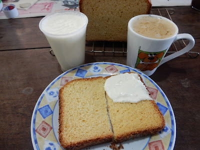 E o café da manhã com um pão de milho feito em casa e o requeijão caseiro que não deu bem certo, ficou tri gostoso!