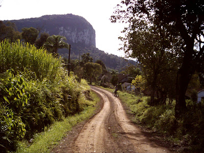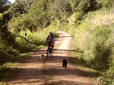 Sofri um pouco no início da pedalada pois custei a me acostumar com o câmbio da bicicleta emprestada pelo Leonardo e também, por causa das subidinhas que tinham pelo caminho. Aliás, que caminho! Uma estradinha de chão com casas simples e belas, muito verde, a cachorrada solta, latindo atrás da gente, muito verde e muitas árvores frutíferas!