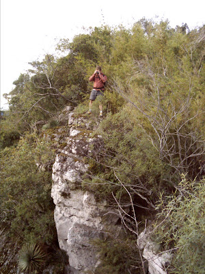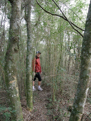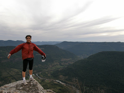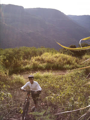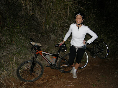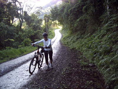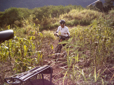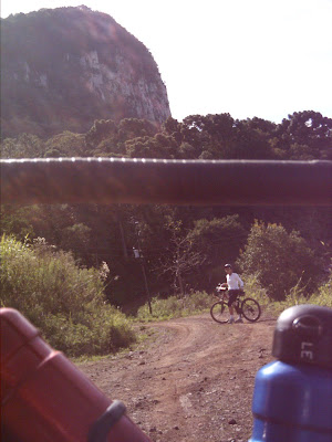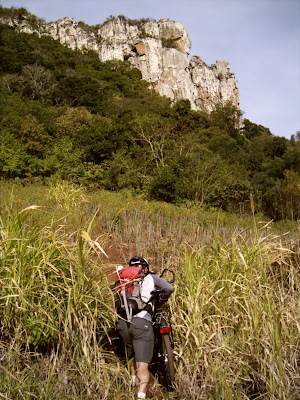 Para chegar nas Pedras do Silêncio, em primeiro lugar, deve-se estar com alguém que conheça o lugar, pois não tem nenhuma placa na estrada indicando uma plantação de aipim como entrada para a trilha. Essa, foi a pior parte da indiada! A tal plantação fica numa subida muito íngreme, não tem como pedalar ali então, tivemos que empurrar as bicis cujos raios trancavam nas mandiocas... além de desviar das mandiocas, tava difícil firmar o pé no chão empurrando uma bicicleta. Resultado: tive que pedir ajuda para os universitários! O Leonardo teve que subir a bici dele e voltar para subir a minha. Infelizmente, faltou técnica da minha parte... obrigada Leonardo!