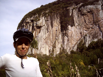 Mais algumas pedaladas e encontramos o Monte Malakoff, um paredão de pedra impressionante. Sem sair da estrada, tiramos algumas fotos e continuamos nossa pedalada pois nosso destino eram as Pedras do Silêncio. A ideia inicial era almoçar lá em cima mas já eram quase quatro da tarde então, faríamos o lanche da tarde.