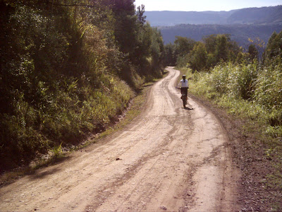 Segundo o meu guia, existem 3 formas de fazer este trajeto: dificuldade pequena, média e grande. O escolhido por ele foi o de dificuldade média, saindo da Linha Imperial pela faixa que leva a Gramado até entrarmos numa estradinha de areia, caminho este aliás, que havia feito 10 anos atrás numa caminhada organizada pelo Leonardo e amigos, o "Caminhando Nova Petrópolis".