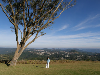 Apesar das várias paradas, achei a viagem rápida (2 horas). Da rodoviária fomos, de carro, direto para o morro da árvore torta. Não sei o nome oficial daquele morro mas o Leonardo chamou assim, então, assim será. Lá de cima podemos ver Picada Café, o centro de Nova Petrópolis e, mais adiante, Caxias do Sul.