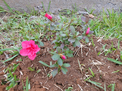 Pelo menos assim, o trabalho fica descontraído. Enquanto eles trabalhavam, eu preparava um pão e um bolo para o café, levava chimarrão para eles e conferia as novas mudinhas plantadas no Recanto, como esta azaléa, tão pequena e já com tanta flor.