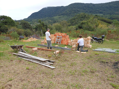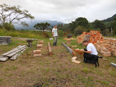 Leonardo está se divertindo com a função da pecinha, que chamo de barraquinho. Estamos fazendo ela ao lado de onde pretendemos, um dia, construir a nossa casinha dos sonhos. A ideia era fazer uma coisa bem simples mas Leonardo está se empolgando e inventando moda. Vamos ver no que vai dar.