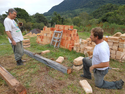 Apesar de termos adquirido o Recanto há dois anos, ainda não temos nossa própria luz, usamos a do vizinho que nos vendeu o Recanto e nos cede a luz pacientemente. Já entramos com 6 pedidos de luz, todos negados! O primeiro pedido foi negado porque a casa está distante mais de 40 metros do poste e por estar numa possível área de APP (Área de Preservação Permanente). O segundo pedido, nem lembro bem como estava a situação, mas a CEEE (Companhia Estadual de Energia Elétrica) apenas deixou um bilhete escrito: "não tem casa" ( a casa não fica visível da rua, pois está na parte baixa do terreno, perto do rio, na área de APP). O terceiro pedido foi feito em abril e resolvemos então, fazer o que todo mundo vinha sugerindo, construir uma peça qualquer lá em cima para ganhar a luz. Contratei dois peões para a função, que no dia seguinte ao pedido, fizeram um quadrado com pedras e madeiras iniciando a obra do barraquinho. Eis que, a CEEE foi até lá no prazo previsto e deixou um novo papelzinho com as seguintes palavras , que transcrevo aqui, tal e qual eles escreveram: item 1 -" cx de medição deve ficar no máximo 5 cm afastada da cerca frontal do terreno" e item 2 - "deve ser dado início na obra (fundação)".