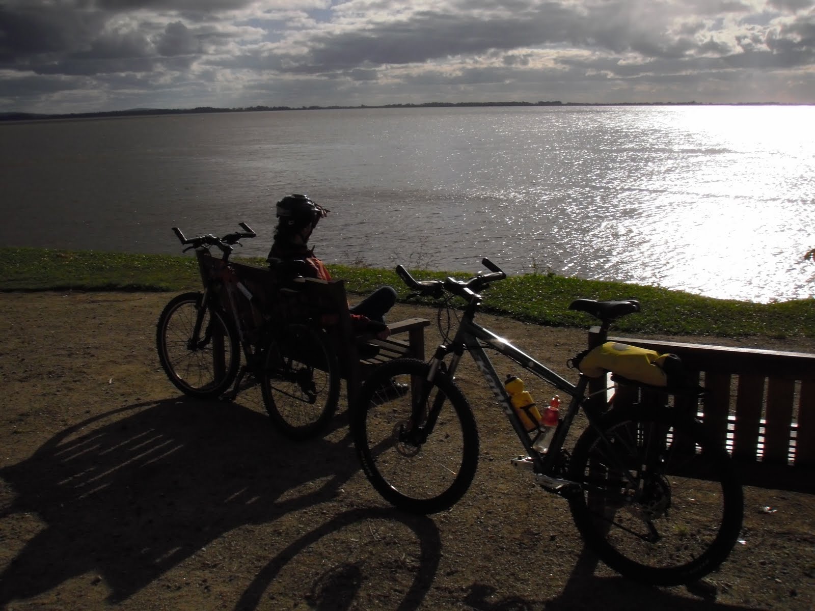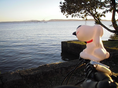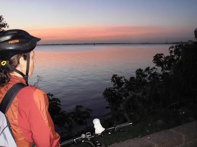 O dia não tinha sido frio, mas com o sol se pondo a temperatura vai caindo e o friozinho chegando. Tratamos de começar a pedalada de volta fazendo mais algumas paradas para fotografar o espetáculo do pôr-do-sol do Guaíba.
